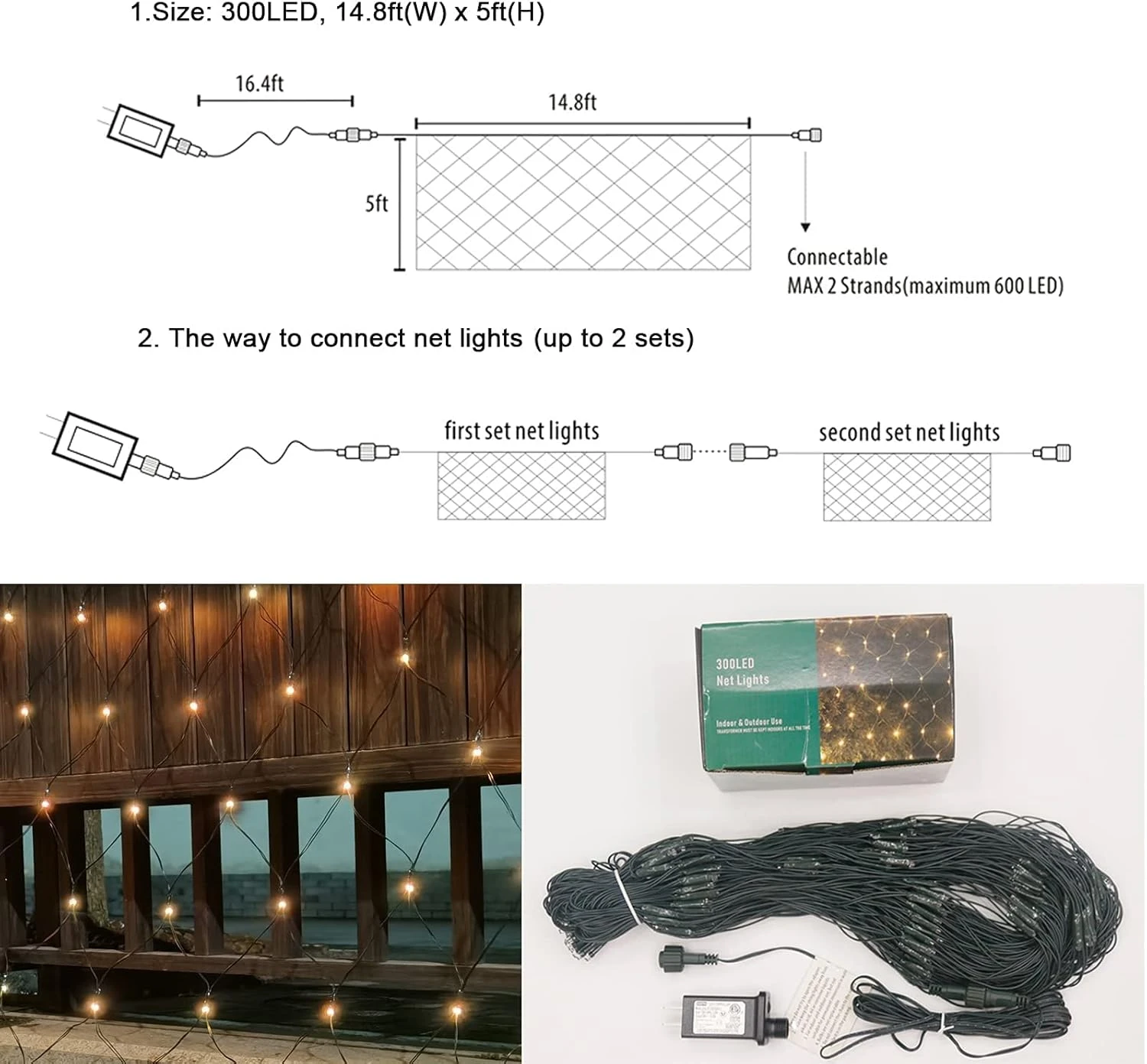 - Spécifications: 300 Super LED lumineuse avec adaptateur certifié UL. La taille de panneau de maille est 14.8ft x 5ft, ce qui est plus, les lumières de chaîne nettes pourraient être connectées bout à bout. Toutes les lumières du réseau peuvent être contrôlées et alimentées par une seule prise. (Note: Le maximum connectable net lumières: 2 ensembles.)
