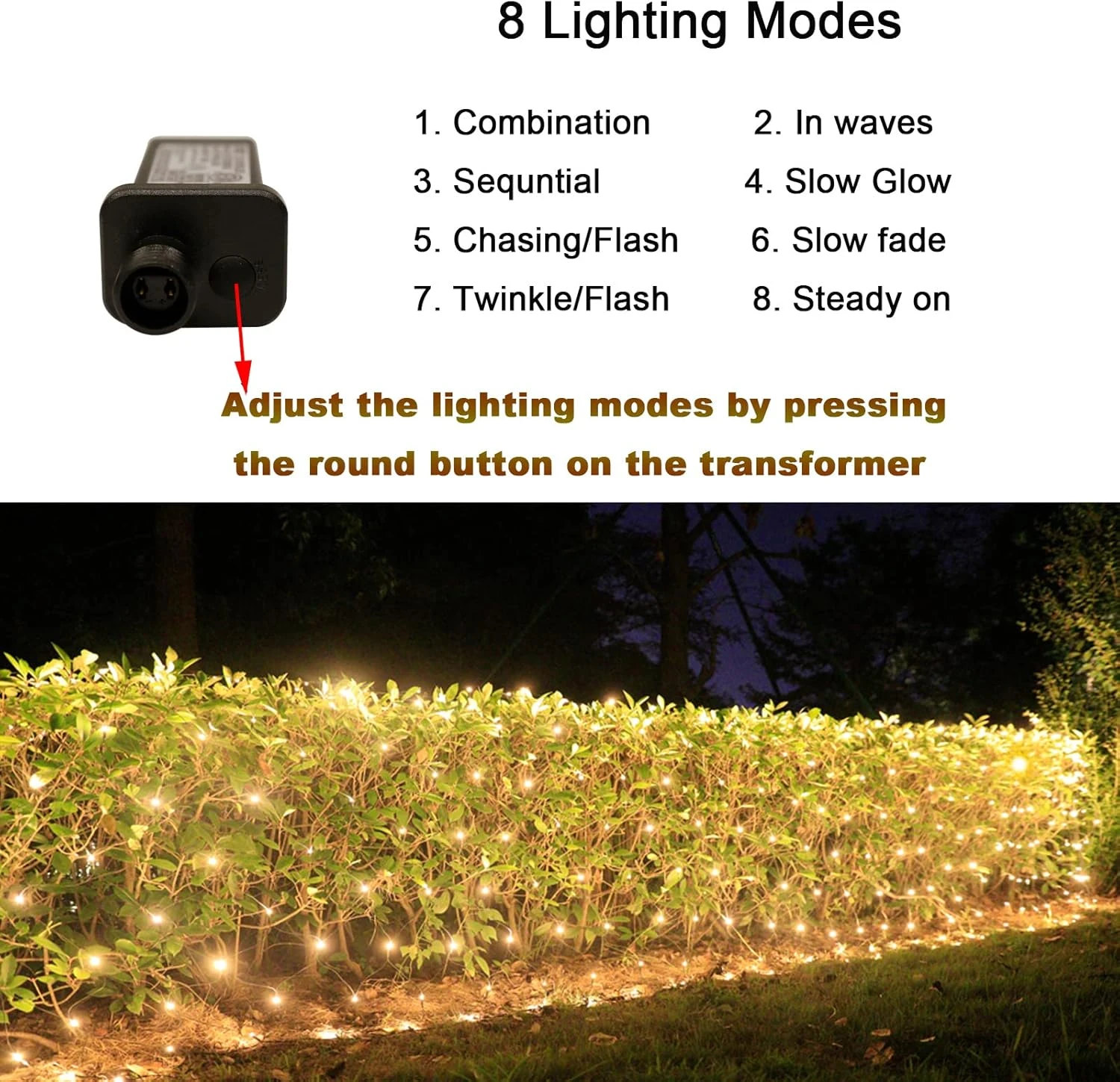 - 8 Modes Paramètres: Combinaison, En Vagues, Séquentiel, Lent Lueur, Chasing/Flash, Lent fondu, Twinkle/Flash, Stable sur (Aucune télécommande). Nous pouvons ajuster les modes d’éclairage en appuyant sur le bouton rond du transformateur.