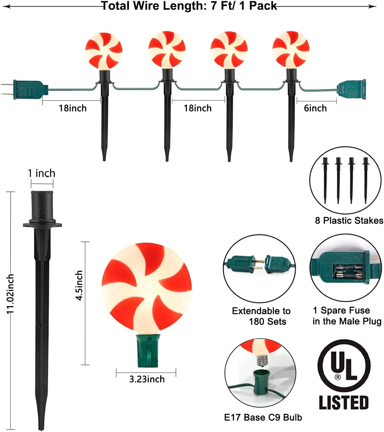 - 🍭C9 LED String Light avec des enjeux: Source LED, 2 ensembles de 4 lollipop forme pluggable lumière de la voie de Noël, total 14 Ft (2 ensembles, 7 Ft chaque ensemble), total 8 sucre menthe poivrée façonner la coquille, ajouter douce lueur blanche chaude pour la décoration de Noël la nuit, regarder si belle et se détendre