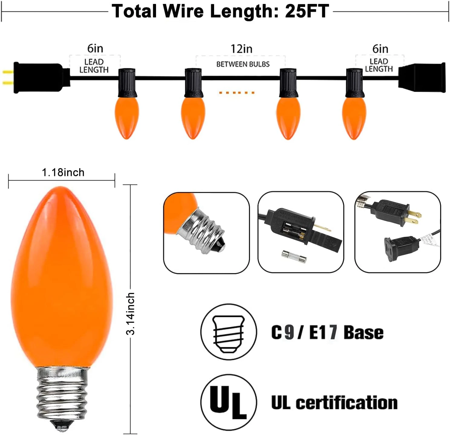 - Décorations de Noël Lumières extérieures: 6″ plomb avec prise mâle, espacement des ampoules de 12″, queue de 6″ avec connecteur femelle. Une ampoule s’éteint sans affecter les autres.UL répertorié et intégré dans le fusible pour la sécurité, les lumières de chaîne d’ampoule orange C9 le rendent facile à créer votre affichage de vacances!