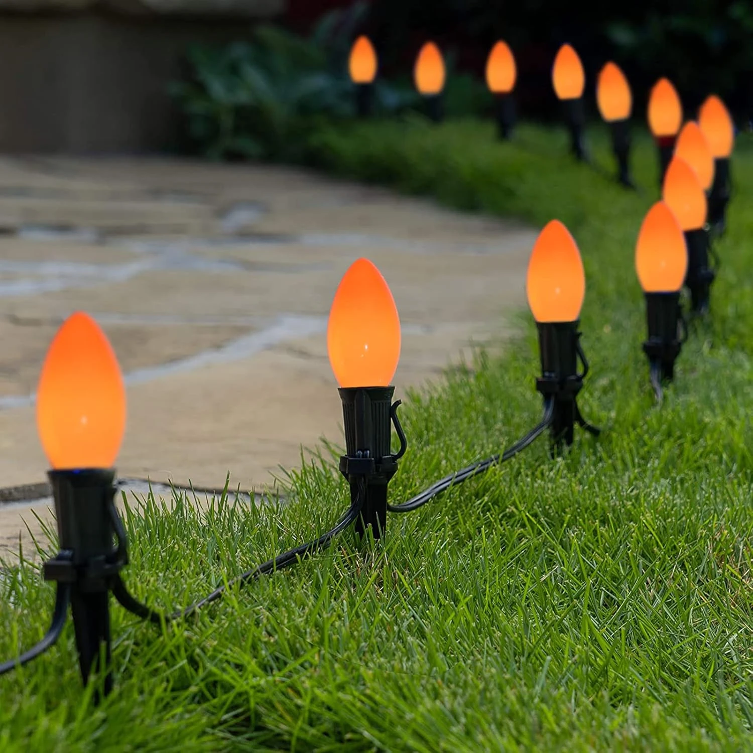 - Noël Orange String Lights: 25 pi. lumières de chaîne orange extérieures avec 26 ampoules incandescentes orange en céramique (1 spare), 7 watts par ampoule, base de candélabre C9/E17, candélabre, convient pour une utilisation extérieure et intérieure.