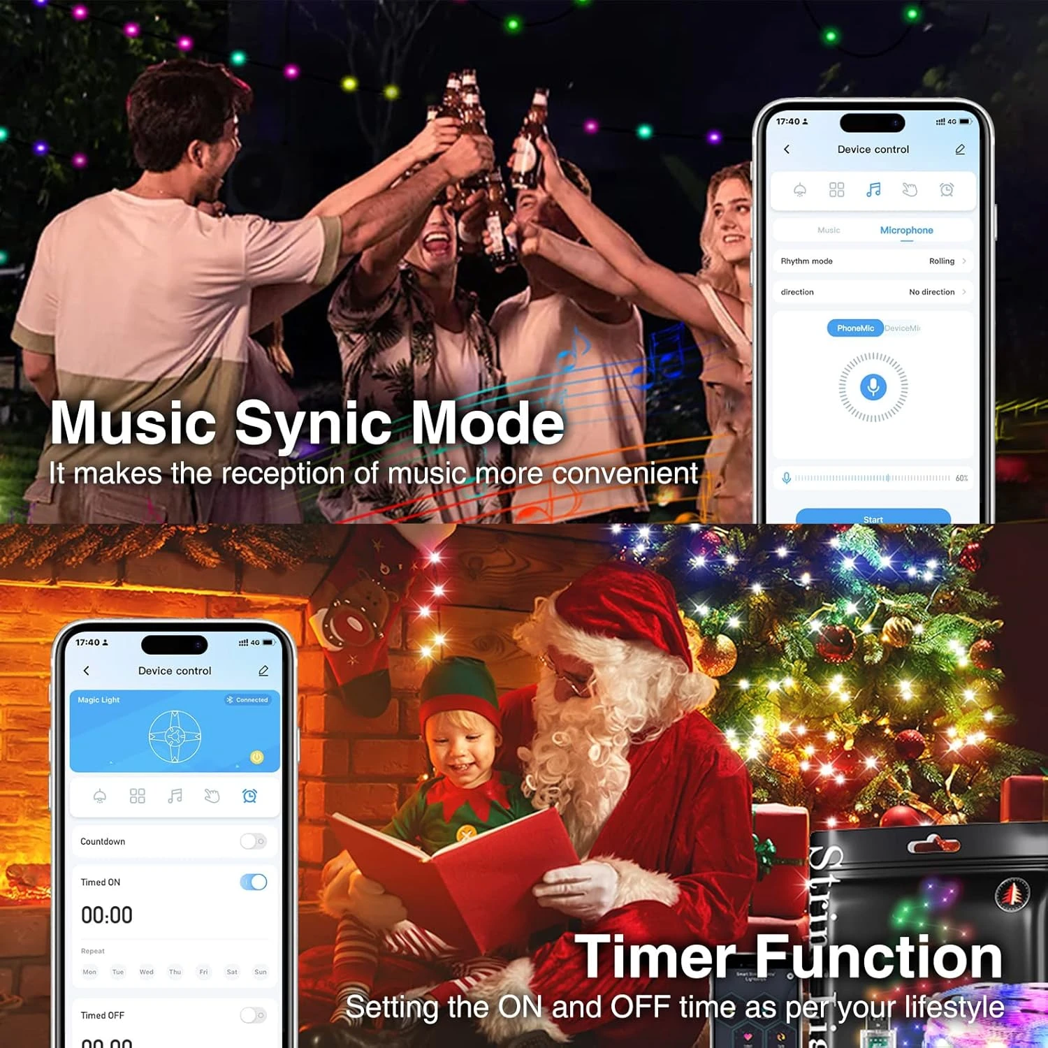 - Ne voulant pas Être Ordinaire, Faites Attention à Votre Vie: Ajouter de la couleur à la musique avec des microphones intégrés, les guirlandes lumineuses peuvent changer avec les rythmes de la musique. Allumer/éteindre automatiquement en tant que décorations pour la chambre à coucher, les guirlandes lumineuses intelligentes rendront votre vie plus facile et plus intelligente