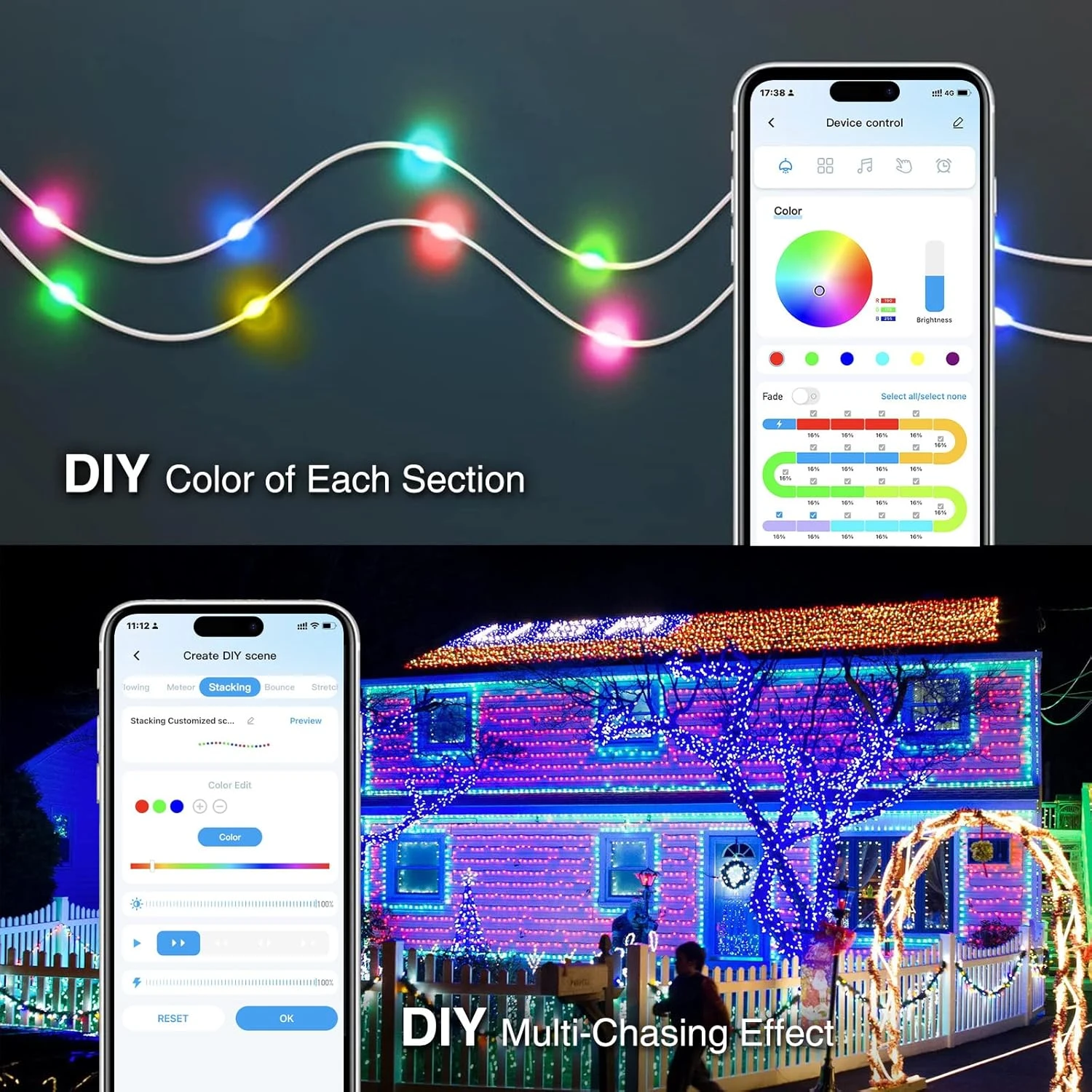 - MULTI-créatif avec DIY Addressable Couleur et Flow Chasing Effet: La couleur et la luminosité des lumières de décorations de Noël peuvent être ajustés par chaque section. Des effets dynamiques de flux, convergence, diffusion et empilement avec différentes couleurs sont possibles