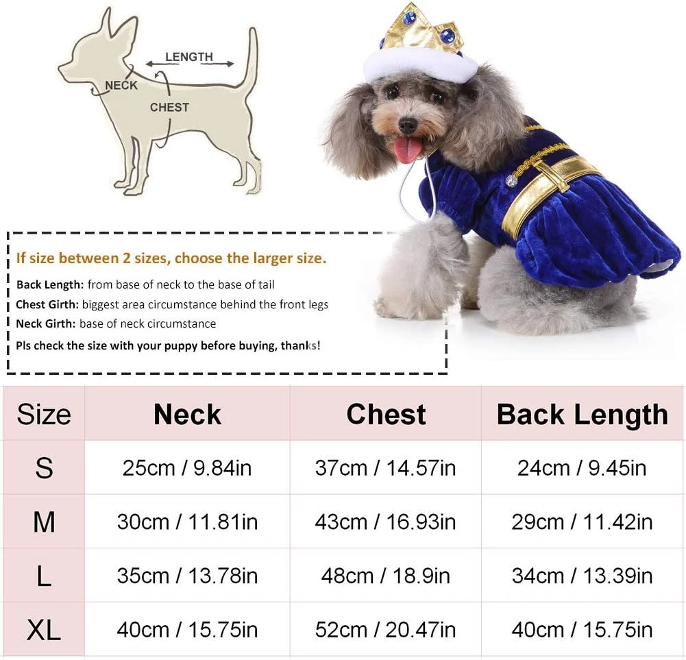 - [EASY TO WEAR] Avec juste la robe et la couronne, devenir le prince le plus noble est un processus simple en deux étapes pour votre chiot. La robe reste en place grâce à la fixation Hook and Loop, et avec une mentonnière réglable, elle est, votre ami n’aura pas à s’inquiéter de perdre sa couronne alors qu’elle descend la Yellow Brick Road avec vous.