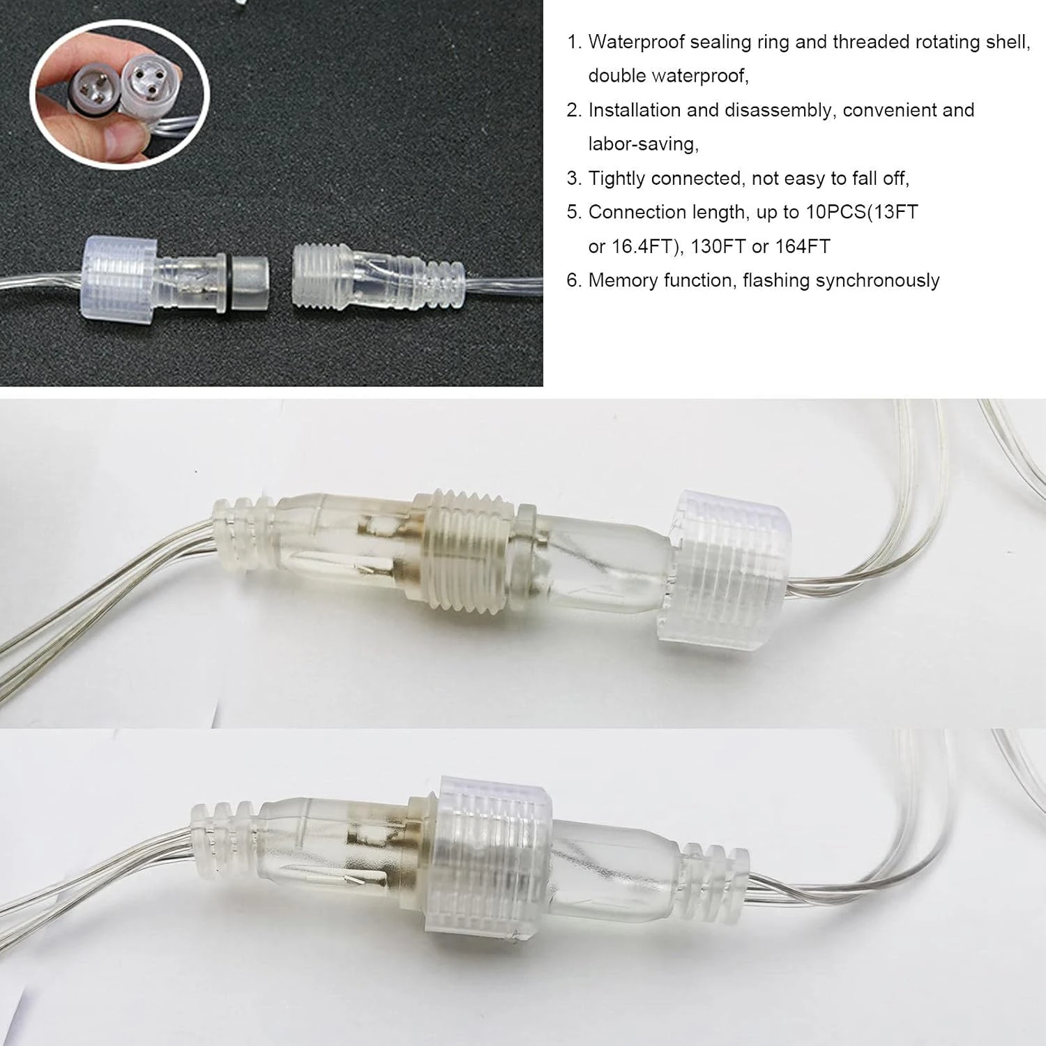 - ❷ Conception connectable: Les guirlandes de rideau sont livrées avec un connecteur mâle et femelle supplémentaire (updated, waterproof) à la tête et à la fin de chaque ensemble pour l’extension, peut être connecté à jusqu’à 10 ensembles de chaînes de lumières pendantes à un seul passage pour répondre à différentes exigences de longueur.