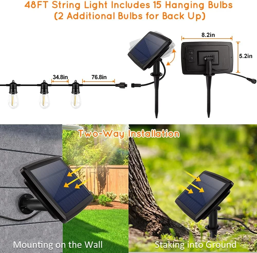 - Installation flexible Solar Powered LED Outdoor String Lights: Plus besoin de trouver une prise de courant lorsque vous allez accrocher une belle chaîne de lumières, le panneau solaire de ces lumières de chaîne extérieures solaires pourrait être placé n’importe où avec la partie incluse de pieu et de bâti, parfait pour la tente, pergola, bistro, terrasse de balcon, jardin, café, mariage, anniversaire, décoration de fête.