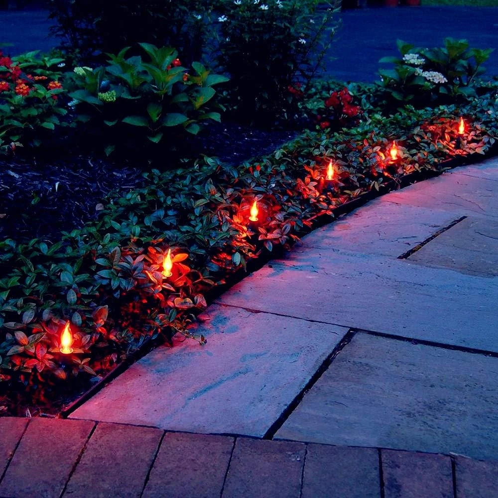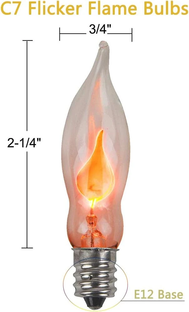 - Chaque chaîne de flammes comporte 10 ampoules avec des flammes scintillantes réalistes lorsque vous les branchez. Les ampoules à flamme sont des ampoules de 1 watt et ont une base de douille de candélabre E12/C7, 120 Tension.