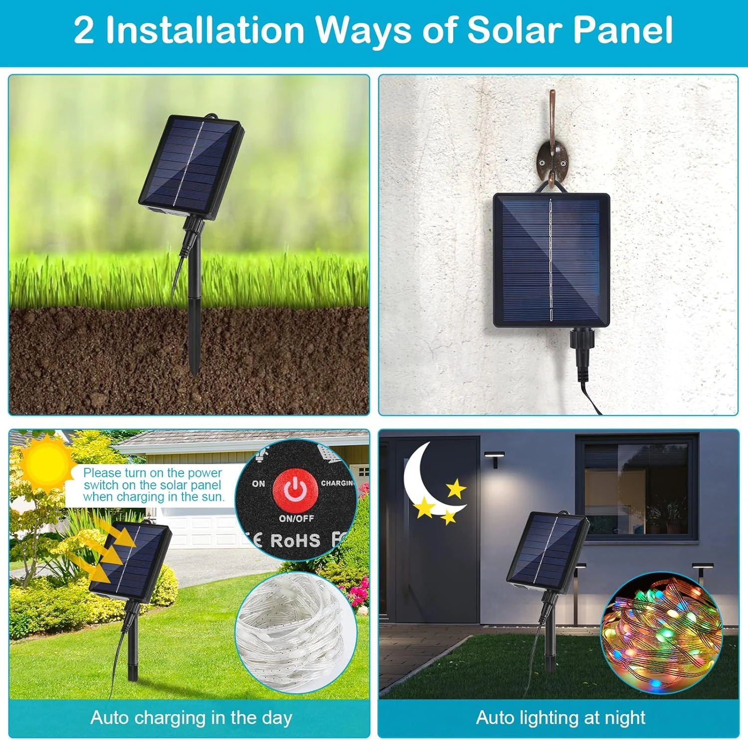 - INSTALLATION FACILE: Le panneau solaire a 2 méthodes d’installation, il peut être inséré dans le sol à l’aide d’un piquet de sol ou accroché à un mur. Le panneau solaire peut être tourné 120°, vous permettant d’ajuster l’angle approprié en fonction de la position du soleil. Lors de la charge, vous pouvez également retirer le panneau séparément et le placer à la lumière du soleil pour le charger. Remarque: Il y a un bouton ON/OFF sur le panneau solaire, assurez-vous de l’allumer avant de charger.