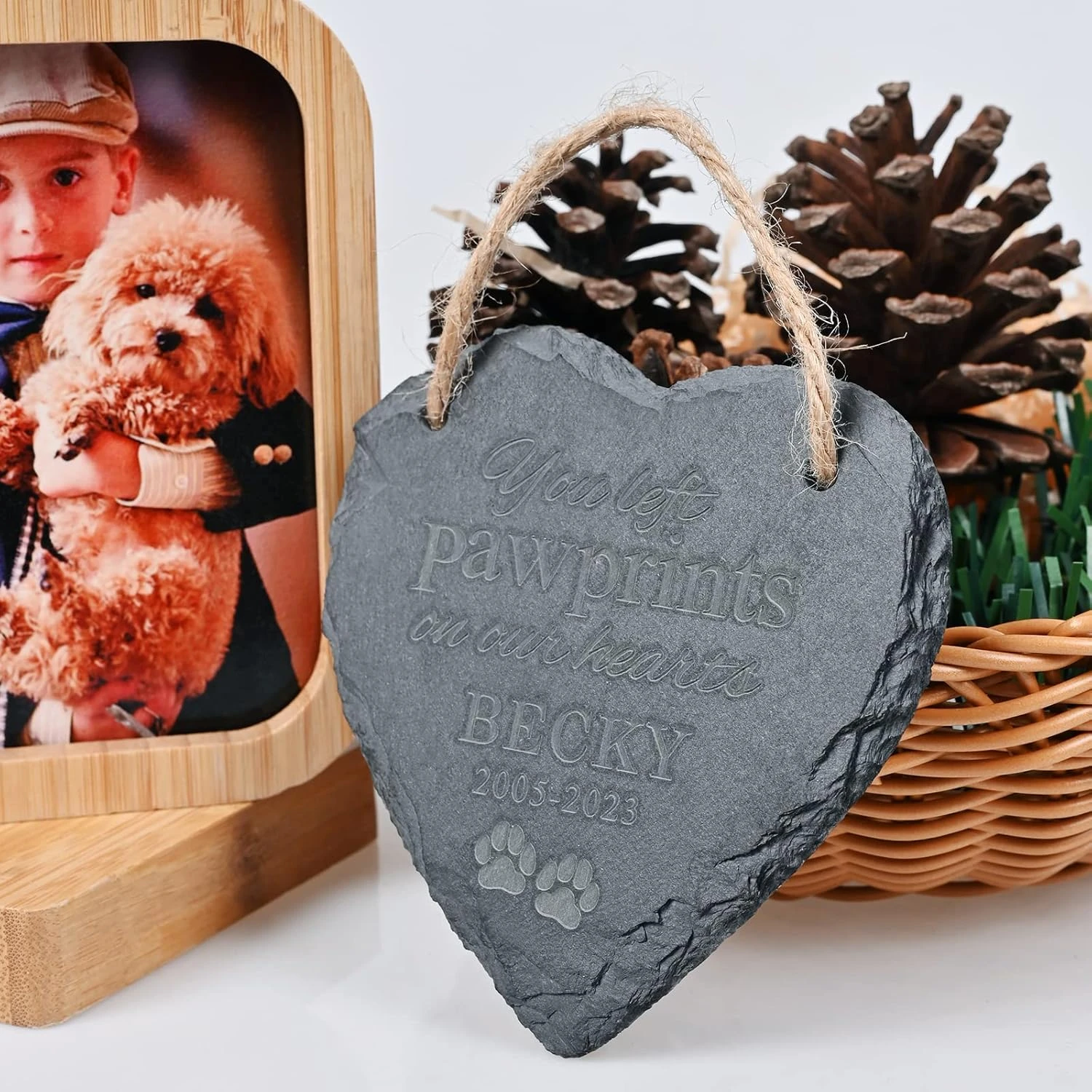 - Ornement de Noël personnalisé: L’ornement de perte d’animaux de compagnie le dessus a la corde de jute le rendant facile à montrer dans un jardin, sur un porche ou d’autres emplacements extérieurs. C’est un cadeau commémoratif et de sympathie pour quiconque a perdu un animal de compagnie aimé.