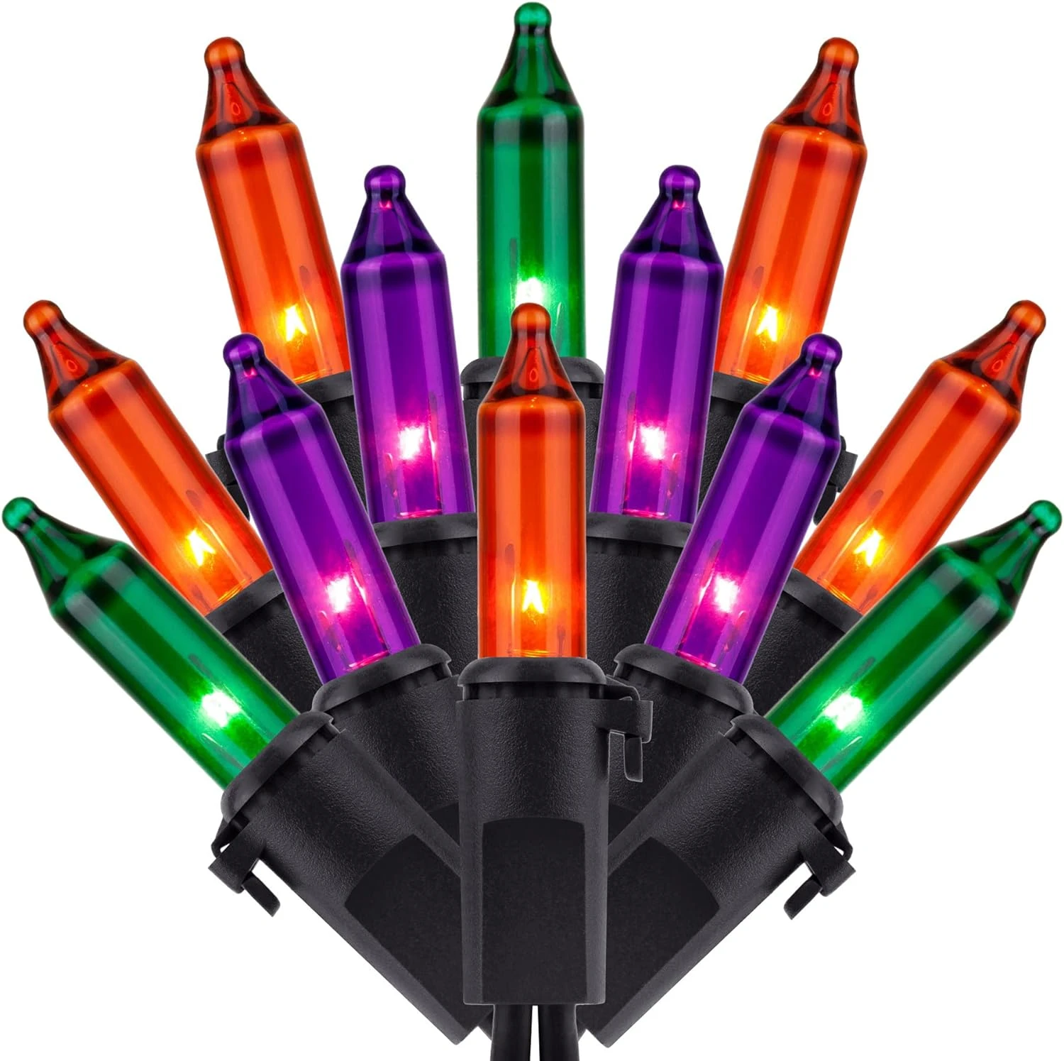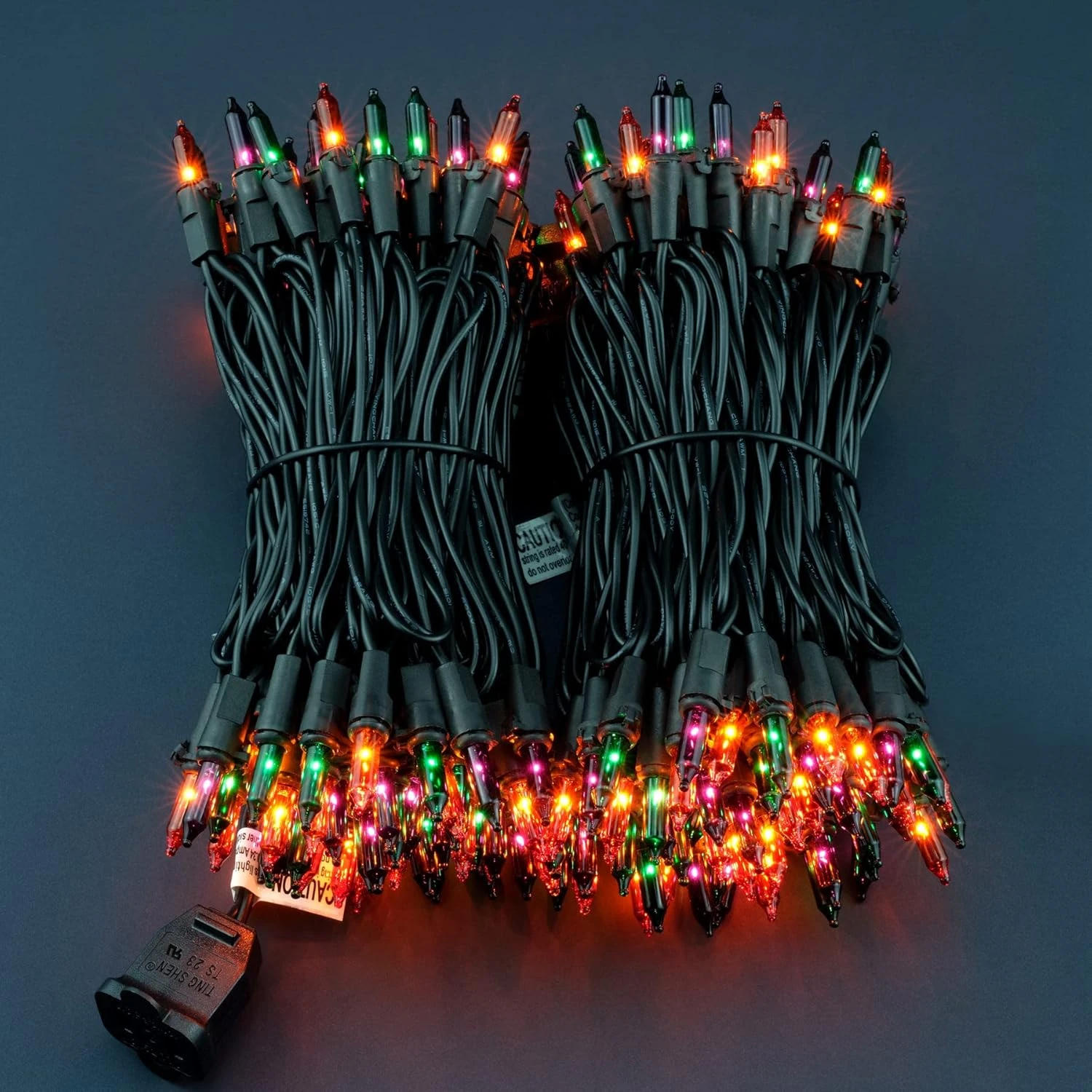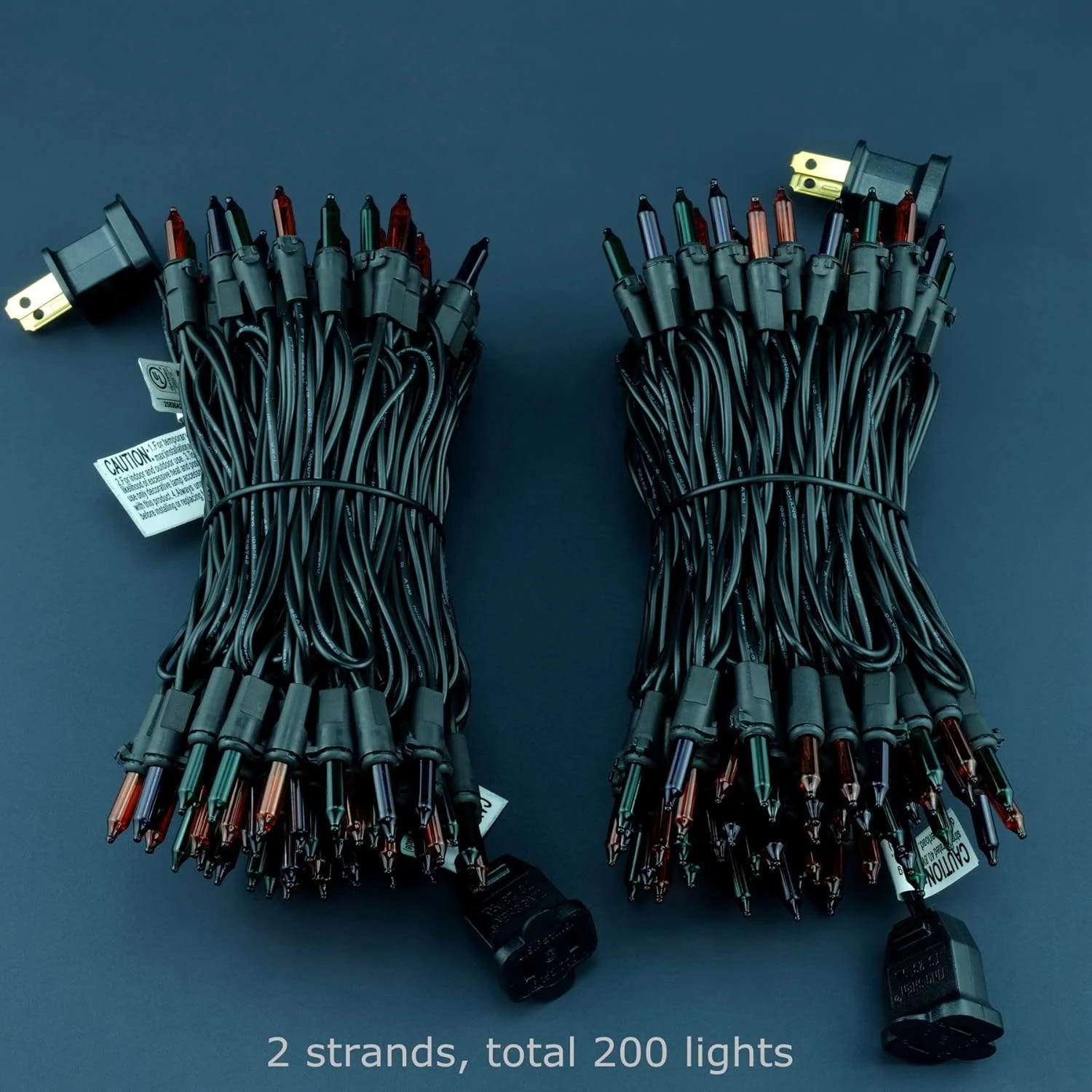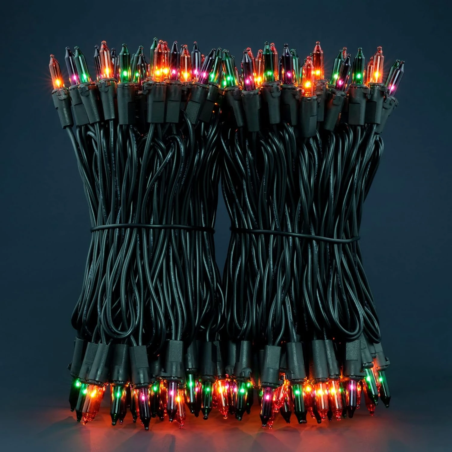 - # SPÉCIFICATIONS # Chaque paquet contient 2 brins de lumières de fil noir, 33 pieds par brin avec 100 lumières incandescentes orange, vertes et violettes. Longueur totale 66 pieds avec 200 lumières. 5 pouces de plomb, espacement de 4 pouces, queue de 5 pouces. Les lumières de Noël à incandescence offrent une qualité supérieure à des prix abordables, ce qui en fait le choix idéal pour une variété de projets d’éclairage.
