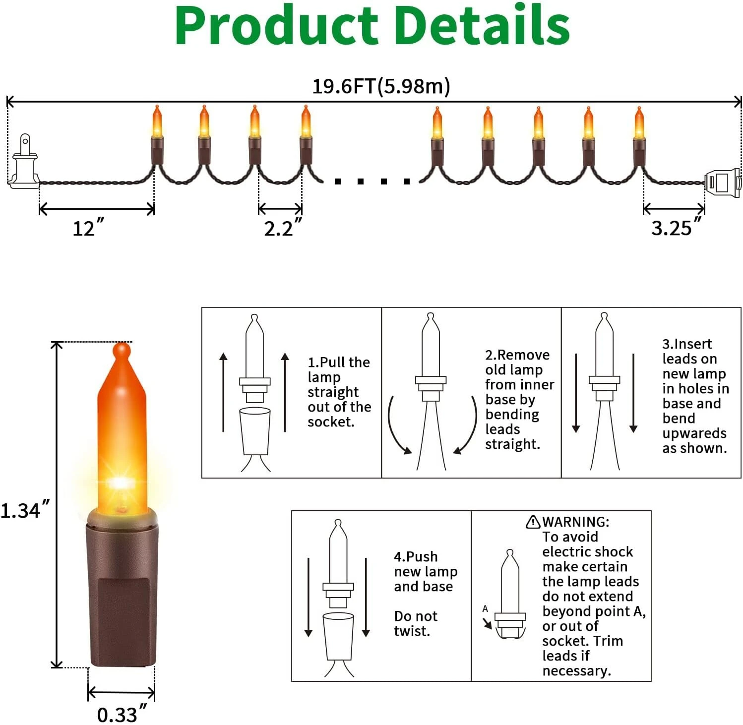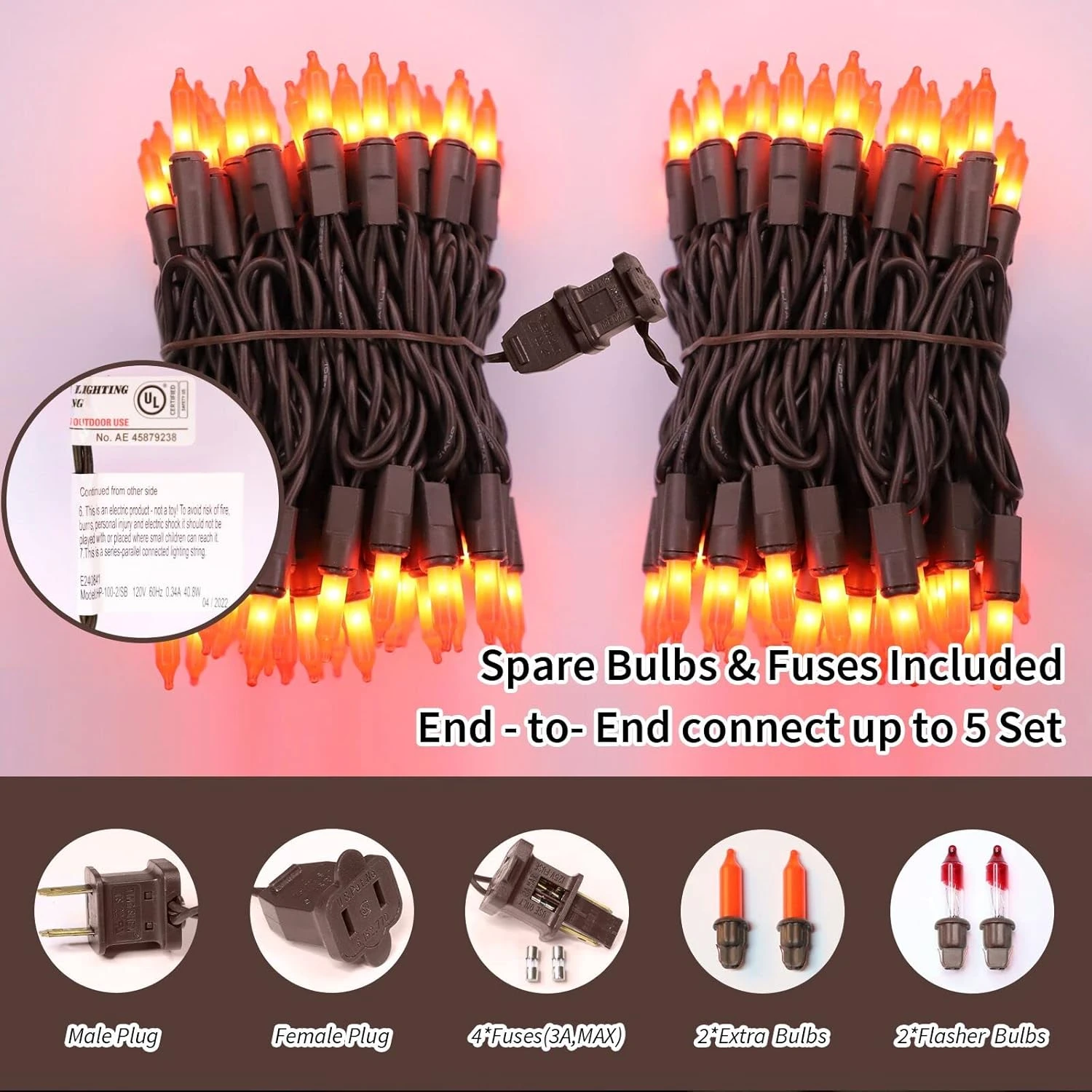 - 9.6FT BROWN WIRE STRING LIGHTS: 100-count lumières orange, avec 2 ampoules clignotantes, 2 ampoules supplémentaires et 2 fusibles de remplacement . Chaque espace d’ampoule 2.5in, 2.5V et 0.425W par ampoules, fusible 3A intégré pour une utilisation sûre.