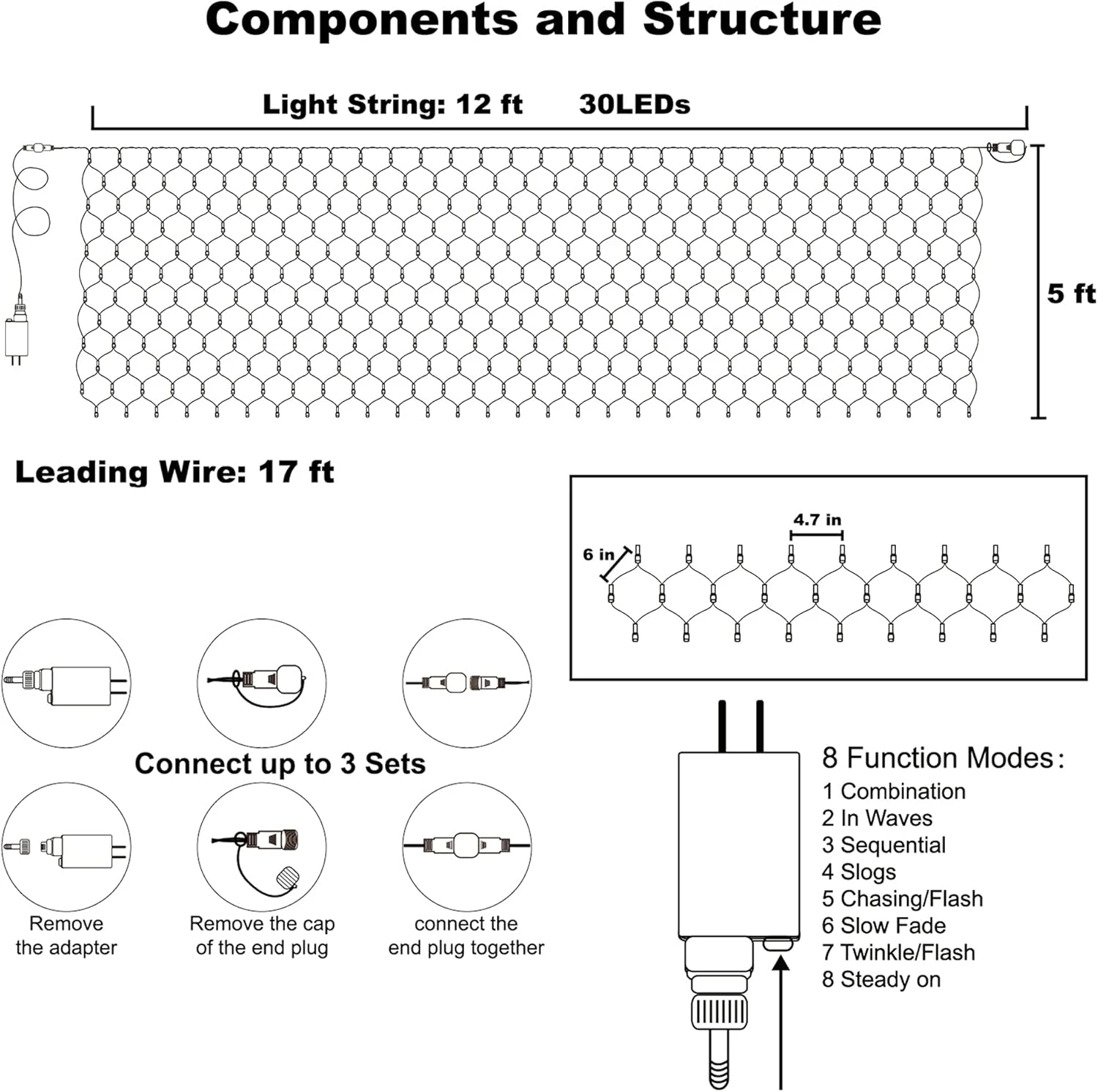 - 8 Fonctions d’éclairage: Nos lumières de chaîne de maille d’Halloween ont 8 modes d’éclairage: combinaison, en vagues, séquentiel, sabots, chasse/flash, fondu lent, scintillement/flash, et stable sur. Adapter différentes occasions, humeurs, sentiments, vacances, festivals, anniversaires, etc. Appuyez sur le bouton rond du transformateur pour changer les modes d’éclairage.