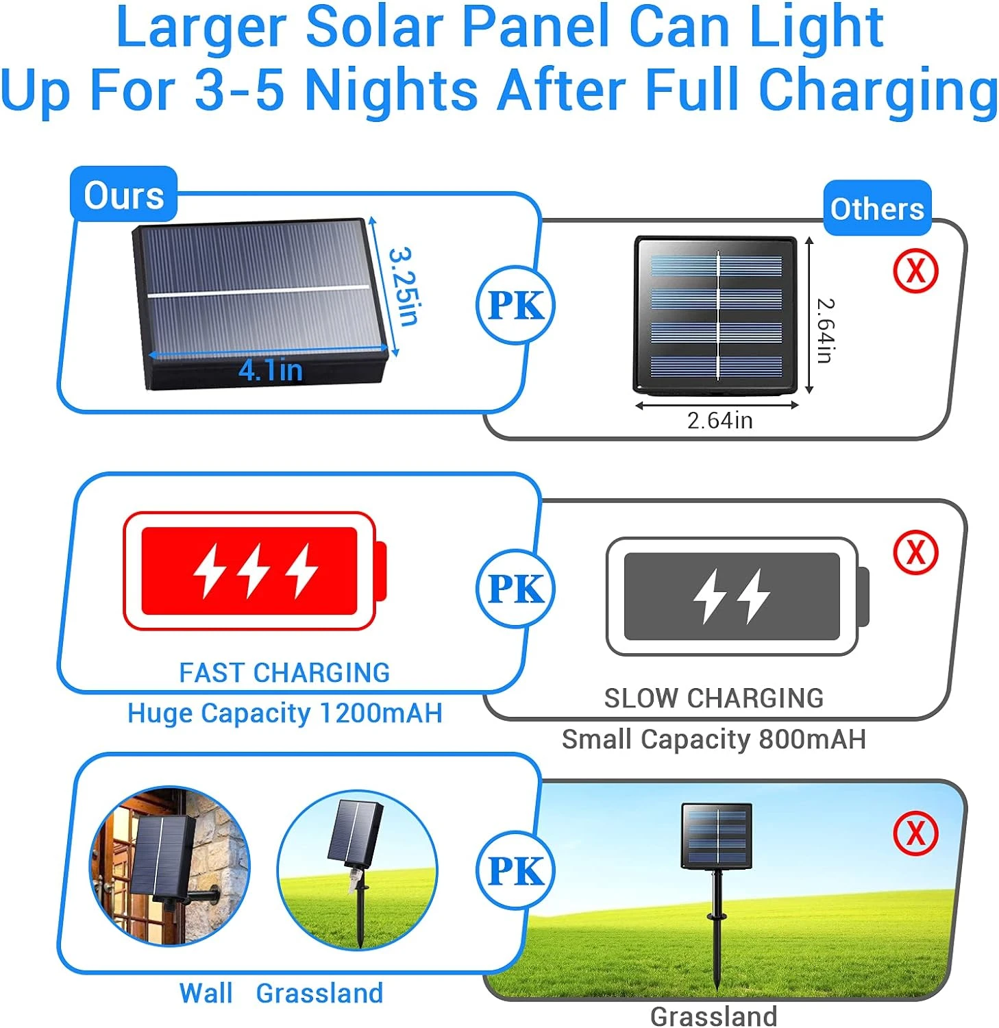 - Économie d’énergie et Protection de l’Environnement – Énergie solaire de haute qualité, économie d’énergie efficace. Il est intégré dans la batterie rechargeable 1200mah, absorbe l’énergie solaire pendant la journée et s’allume automatiquement au crépuscule. La batterie peut être allumée en continu pendant 8-12 heures lorsque complètement chargée