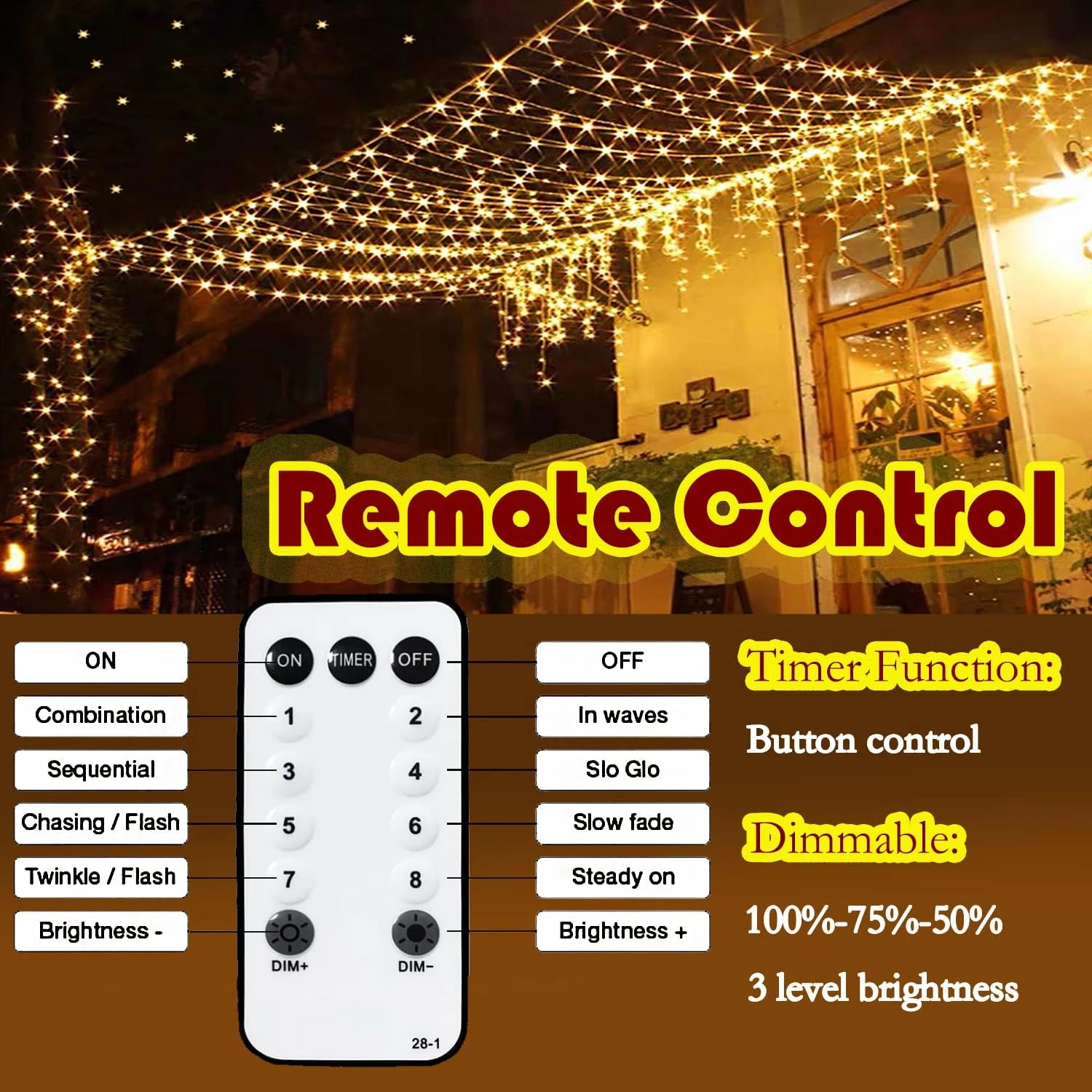 - 3 Niveaux de luminosité et 8 Modes d’éclairage: Dimmable (100%-75%-50% trois niveaux de luminosité) et fonction de minuterie (6 heures sur/18 heures off).8 modes d’éclairage (1. Combinaison, 2. En vagues, 3. Séquentiel, 4. Slo Glo, 5 ans. Chasing Flash, 6. Lent fondu, 7. Flash scintillant, 8. Stable on). Les puces de mémoire intégrées des lumières de Noël intérieures et extérieures sauveront votre dernier réglage. Il est très facile à utiliser, sans avoir à réinitialiser le mode tous les jours.