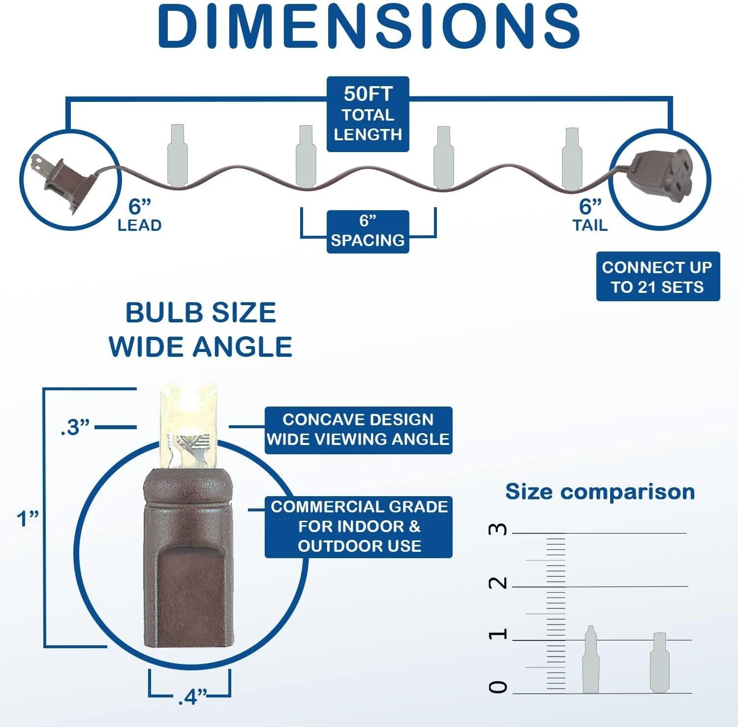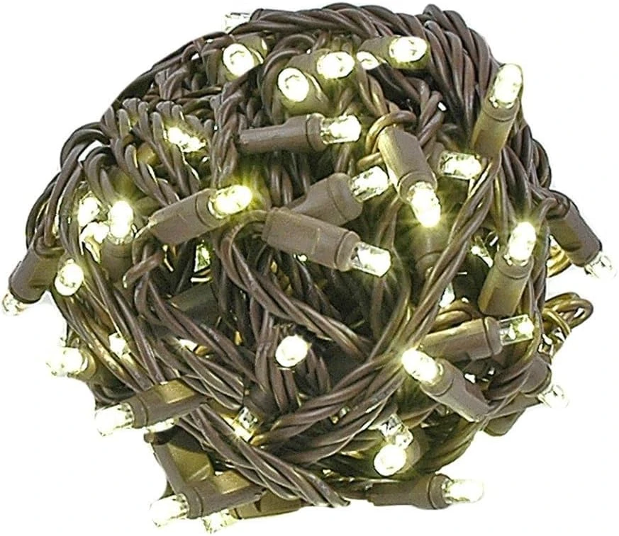 - [SPECIFICATIONS] Set de 100 ampoules LED blanches chaudes (soft white) sur 50 pieds de fil brun de calibre 22. Les ampoules de 5 mm sont espacées de 6 pouces, et il y a une avance de 6 pouces et une queue de 6 pouces. Ces ensembles sont connectables bout à bout avec un maximum de 21 cordes connectées sur une seule prise (1050 pieds total). 9.6 Watts (0.08 Amps) Par Ensemble. Empilable Fused Plug Avec 2 Extra 3 Amp Fusibles