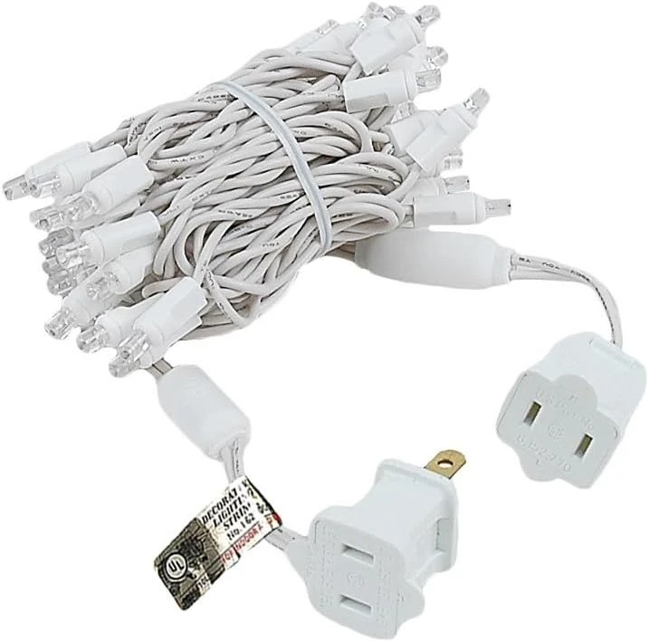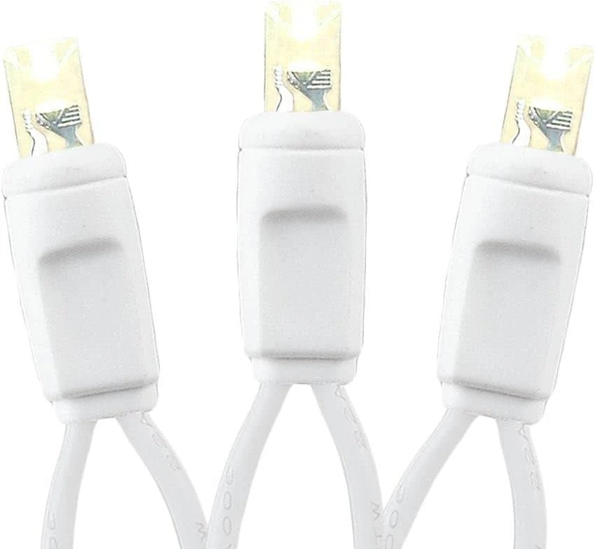 - [SPECIFICATIONS] Ensemble de 50 ampoules LED blanches chaudes (soft white) sur 25 pieds de fil blanc de calibre 22. Les ampoules de 5 mm sont espacées de 6 pouces, et il y a une avance de 6 pouces et une queue de 6 pouces. Ces ensembles sont connectables bout à bout avec un maximum de 43 cordes connectées sur une seule prise (1075 pieds total). 4.8 Watts (0.04 Amps) Par Ensemble. Empilable Fused Plug Avec 2 Extra 3 Amp Fusibles
