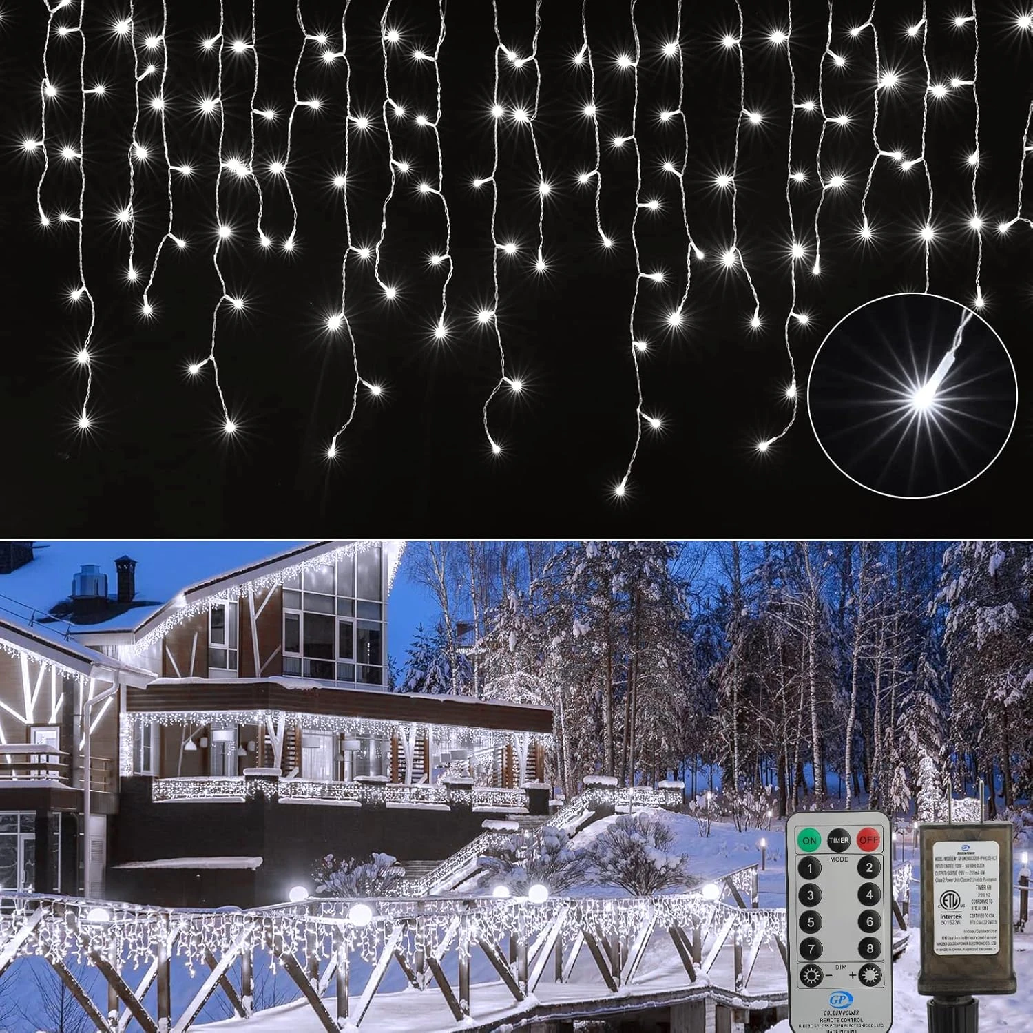 - Fonction Dimmable & Timer: Les lumières de glace de Noël en plein air sont livrées avec une télécommande, qui peut allumer/éteindre les lumières, commuter 8 modes d’éclairage, ajuster le niveau de luminosité et régler la minuterie pendant 6 heures