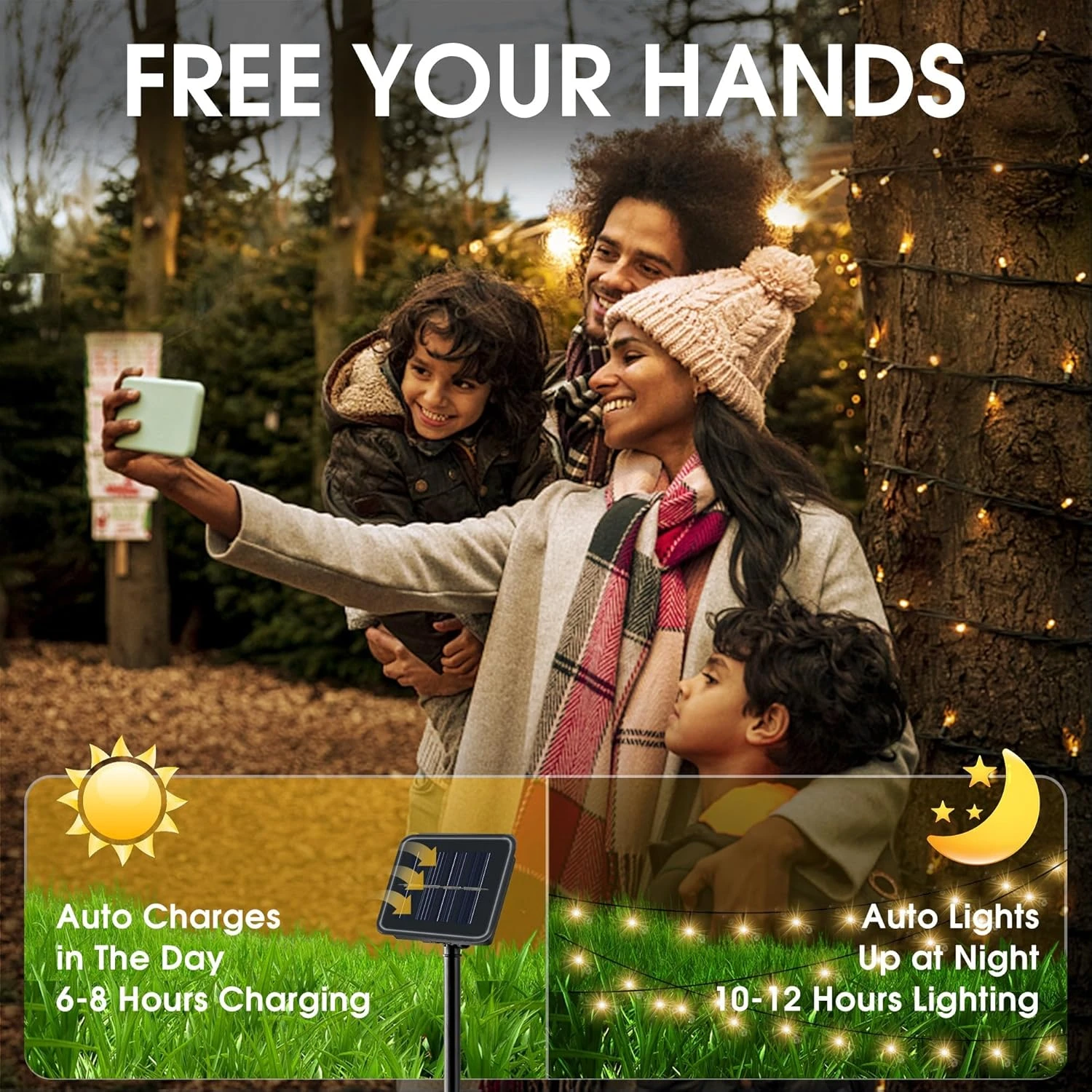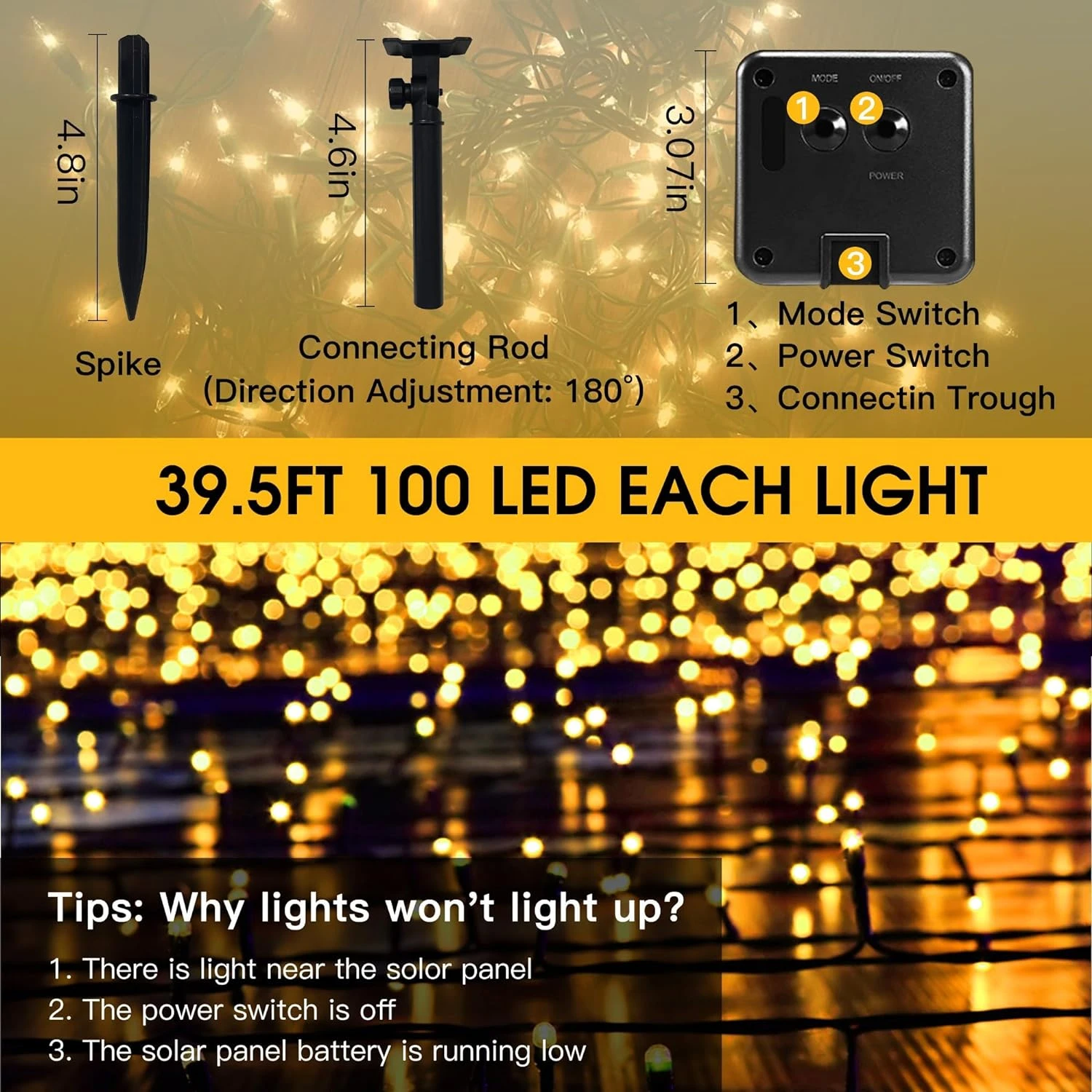 - 💡ENERGY SAVING AND EFFICIENT: Cette chaîne extérieure s’allume à l’énergie solaire avec des packs(2, chacun 100LED 33FT ) n’a pas besoin d’énergie électrique supplémentaire. Après avoir été complètement chargé en 8-10 heures, il peut fonctionner pendant 10-12 heures, qui peuvent être utilisées toute la nuit.