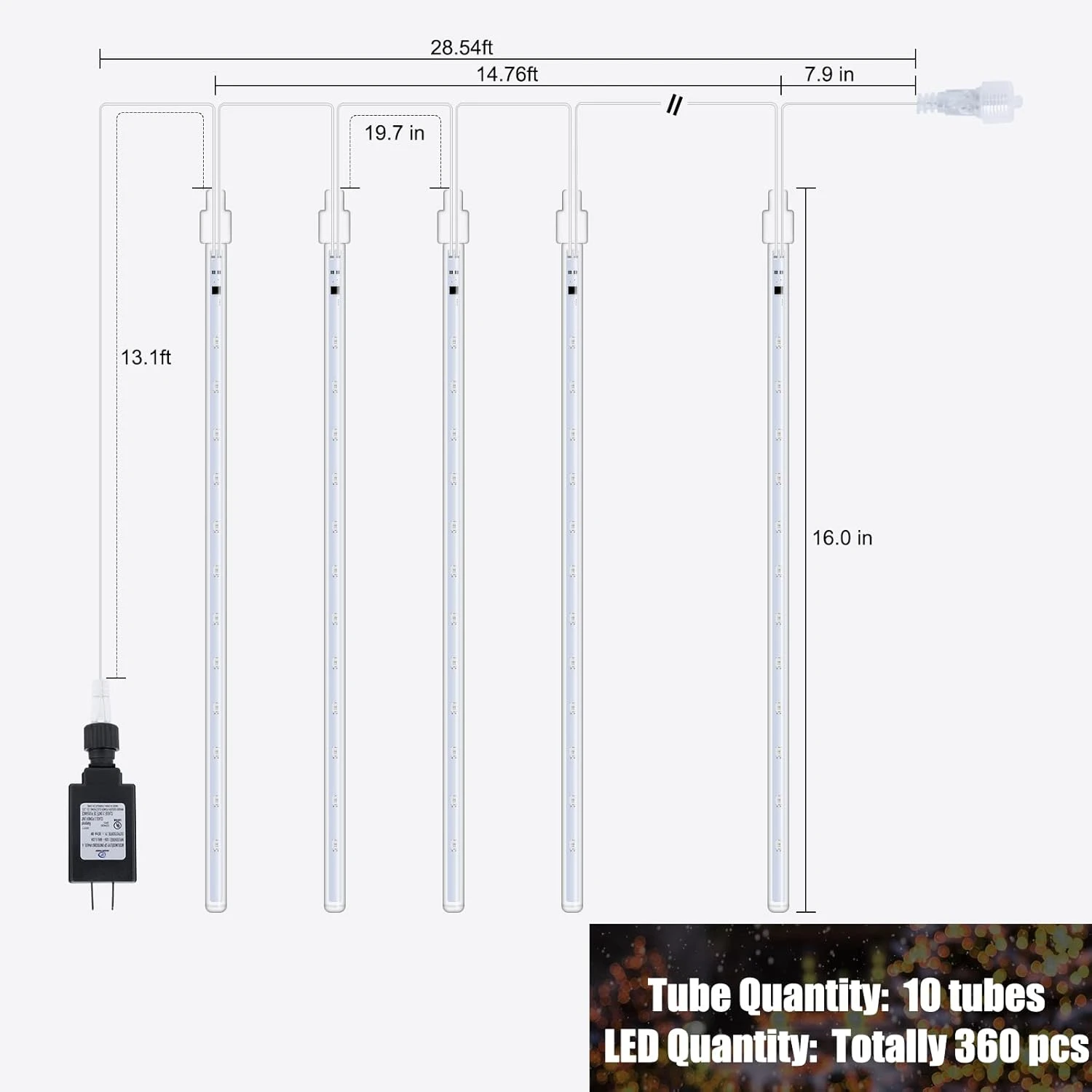 - Lumières LED Meteor connectables: fil d’attaque de 13,1 pieds de long, 10 tubes, chaque tube 36 LED, chaque tube 16 pouces de long, 1,64 pieds d’espacement entre les tubes, 0,98 pieds de long queue, ligne, ainsi, la longueur totale des lumières de météore est de 25,56 pieds Jusqu’à connecter 4 ensembles pour s’assurer de leur luminosité. Cette longueur est très appropriée comme décoration de lumières suspendues de vacances, accrochant ces lumières de pluie sur des arbres, des magasins, des avant-toits, et d’autres endroits élevés.