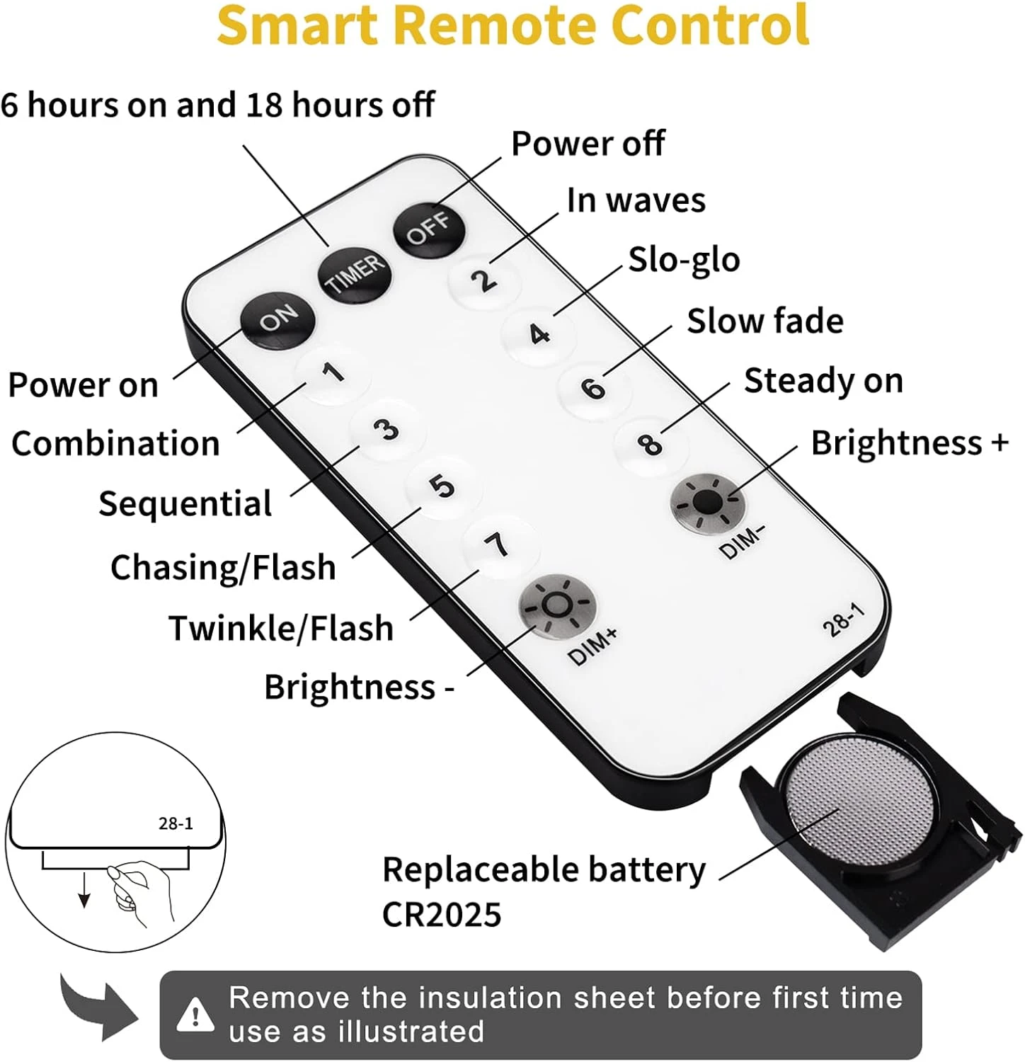- 8 Modes d’éclairage et minuterie et gradateur: Les lumières ont 8 modes d’éclairage et une fonction de mémoire qui vous permet de définir votre mode spécifique. Utilisez la fonction de minuterie de la télécommande pour allumer les lumières pendant 6 heures et éteindre automatiquement pendant 18 heures chaque jour. Réglez la luminosité par gradateur pour s’adapter à des occasions spéciales comme la datation, mariage, anniversaire ou fête d’anniversaire