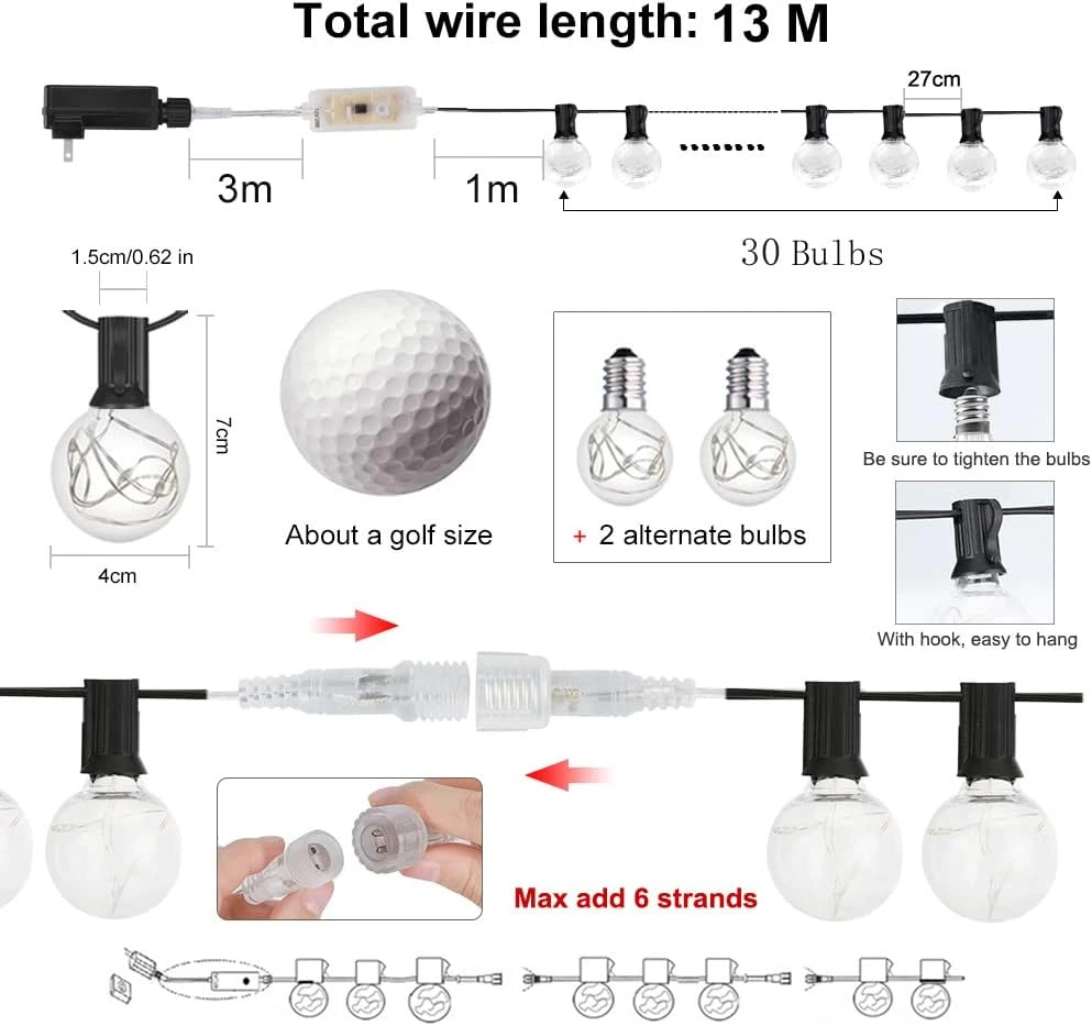 - 【 Connectable et facile à installer 】 Ces lumières de chaîne peuvent être connectées jusqu’à 6 chaînes. Le bas de l’ampoule est conçu avec des barbes fixes, pas besoin d’acheter des clips supplémentaires. Vous pouvez accrocher la chaîne de lumières directement ou enrouler les ampoules autour d’objets tels que des arbres, des clôtures et des murs. Nous avons également conçu une rallonge de 3 mètres pour garantir que la corde lumineuse peut être facilement connectée à la source d’alimentation.