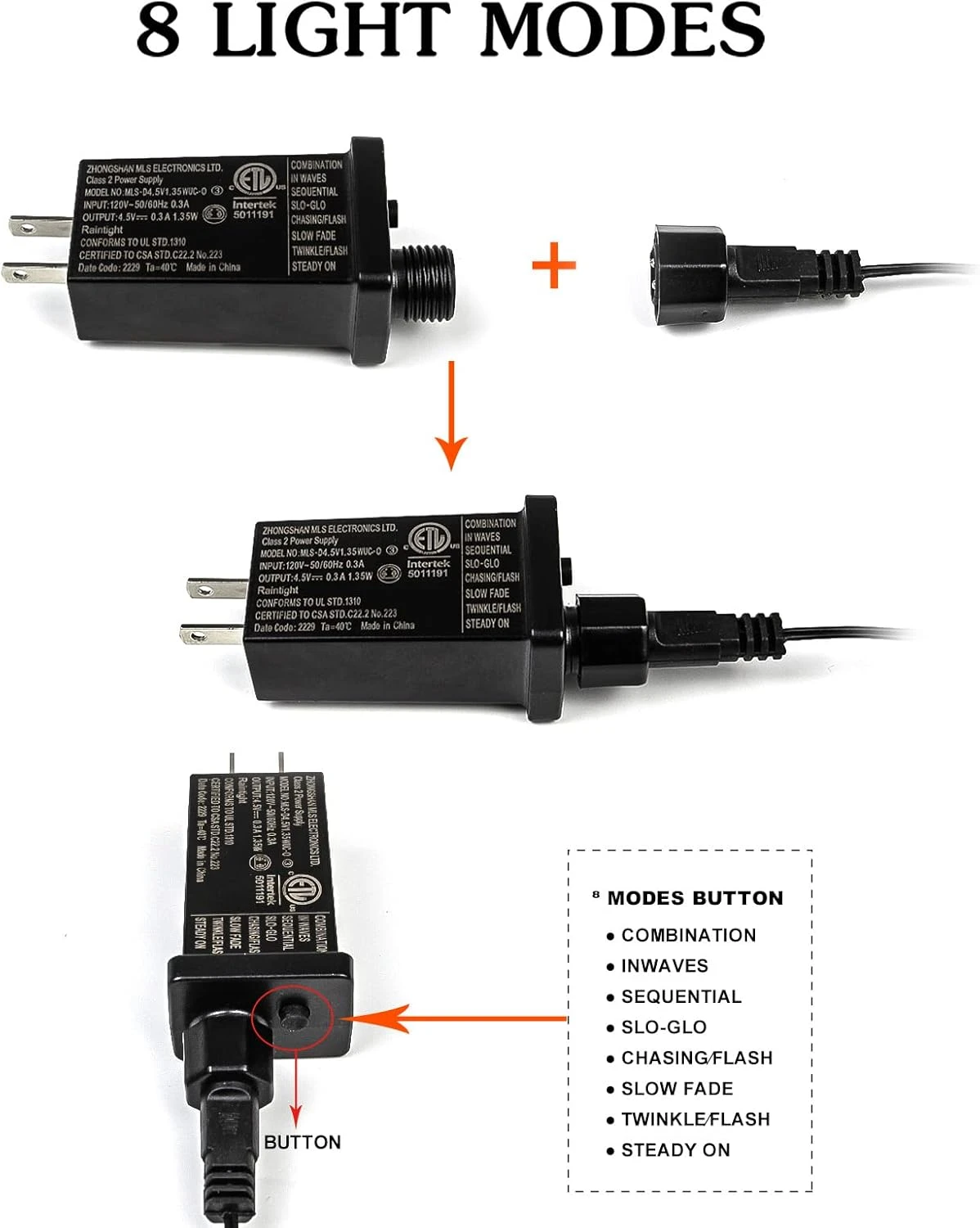 - 【UL CERTIFIED Plug in string light 】: Cette string light est équipée d’un transformateur UL CERTIFIED, ce qui rend la lumière entière très faible consommation d’énergie. Le transformateur est livré avec des modes flash 7 et en mode marche, le bouton de commutation est sur la queue du transformateur. Imperméable (IP44) Parfait pour les décorations intérieures et extérieures.