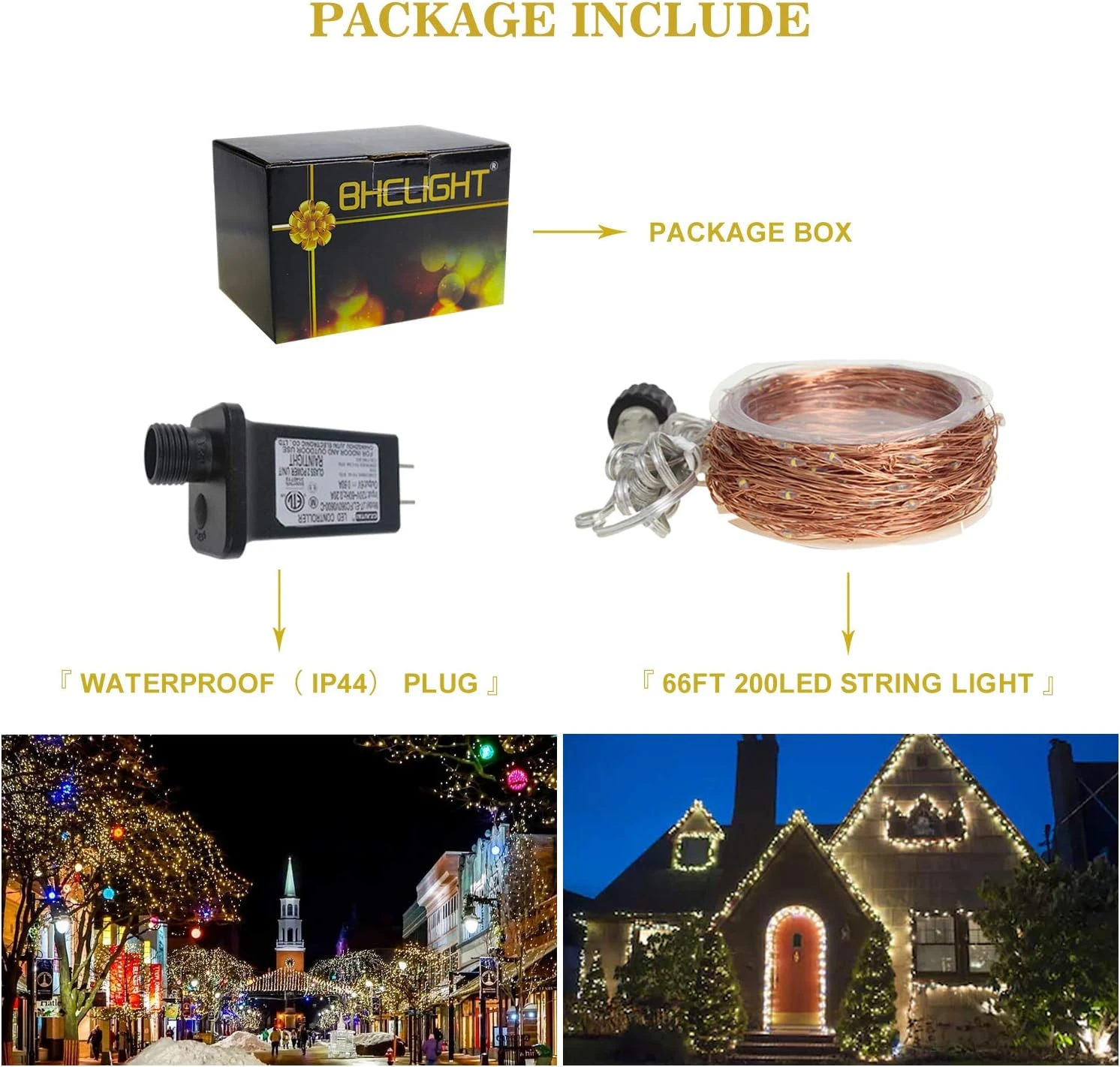 - 【200 LED Fairy Lights】: Brightness amélioré 200LED 66FT string lights, Warm White, IP44 Waterproof, UL588 Approuvé, 8 Modes, belle lumière scintillante pour la chambre décorative, idéal pour la fête, le mariage, Thanksgiving, Noël, etc.