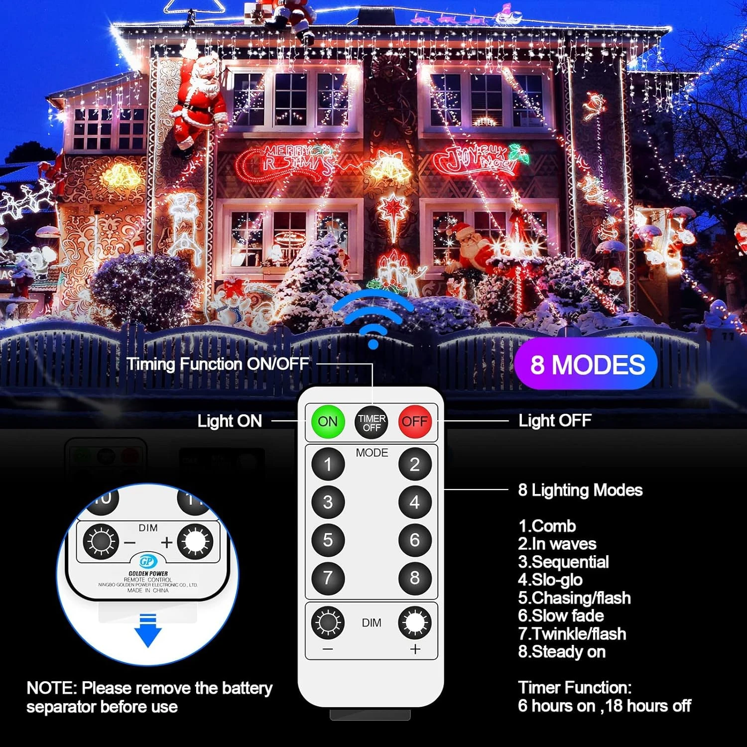 - 🌲【8 Modes & Dimmable & Timer Fuction】Les lumières de Noël extérieures ont 8 modes de lumière différents: Combinaison, En ondes, Séquentiel, Slo-glo, Chasing/flash, Slow fade, Twinkle/flash, Steady on.4 réglage de luminosité de niveau (100%, 75%, 50%, 25%). Ouvrez la fonction de minuterie, les lumières de chaîne seront 6 heures allumées et 18 heures éteintes.