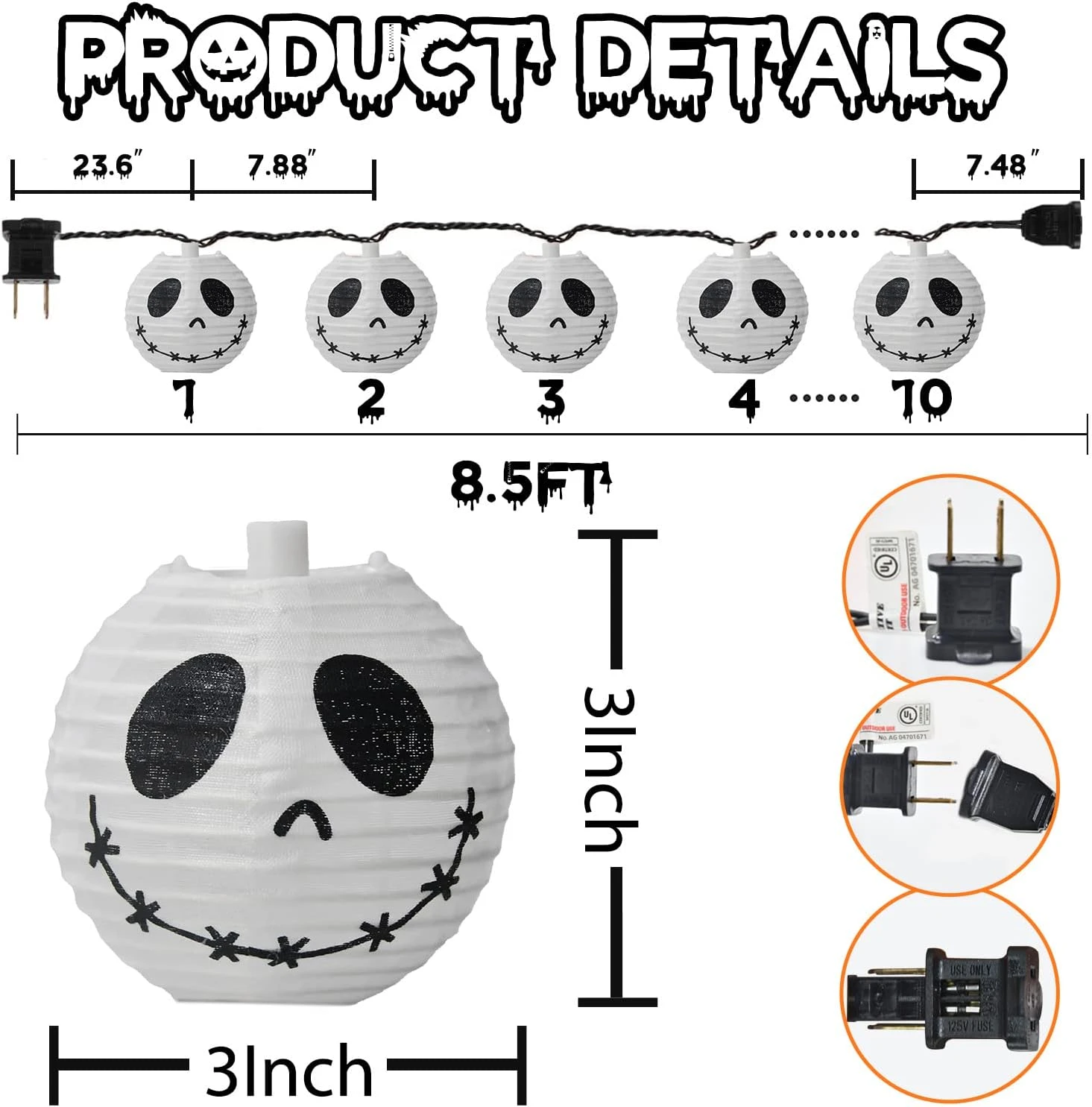 - 👻【UL Certifié, Assurance Sécurité】Ces lumières d’Halloween sont certifiées UL et les fils sont trois fils flexibles isolés. De plus, cette lampe deocr Halloween est alimentée par une basse tension et ne surchauffera pas après une utilisation prolongée, 0,84 Watt par ampoule, 8,64 par chaîne, sécurité et sécurité d’utilisation.