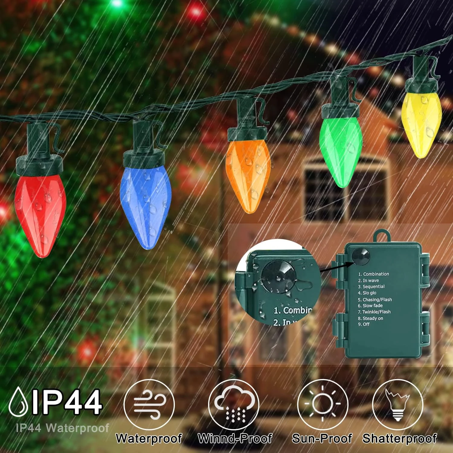- 🌈【 Smart Remote Control avec Timer】 C7 Colorful Lights ont une longue télécommande sans fil avec mémoire et fonction de minuterie. Vous pouvez régler le niveau de luminosité que vous aimez, et régler la minuterie pour que les lumières s’allument pendant 6 heures ou s’Éteignent 18 heures tous les jours automatiquement.