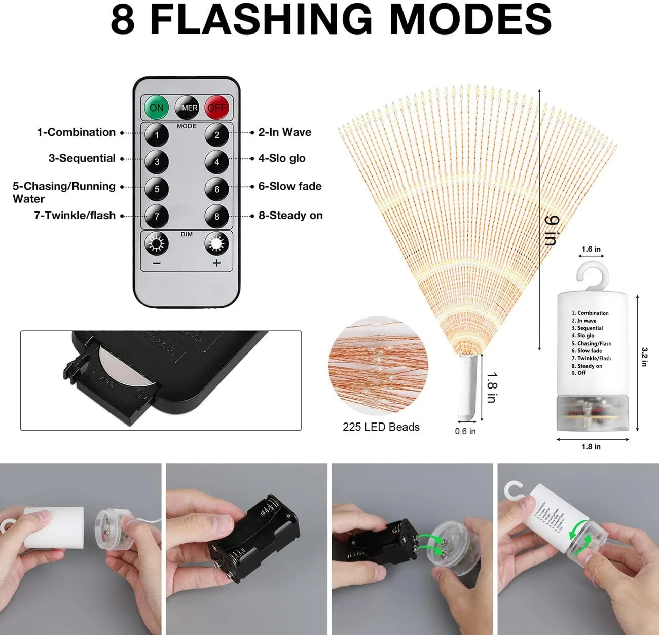 - 225LED Fées Lumières de Noël: Les lumières décoratives starburst design comme une forme de bouquet, comprennent 45 branches fils de cuivre dans un tas et 225 LED micro lumières. Aucune sortie requise.Les lumières Starburst se plient facilement et se transforment en toutes formes, des lumières décoratives parfaites pour l’anniversaire, des guirlandes de fées à led, des lumières de Noël à led, des lumières de fête