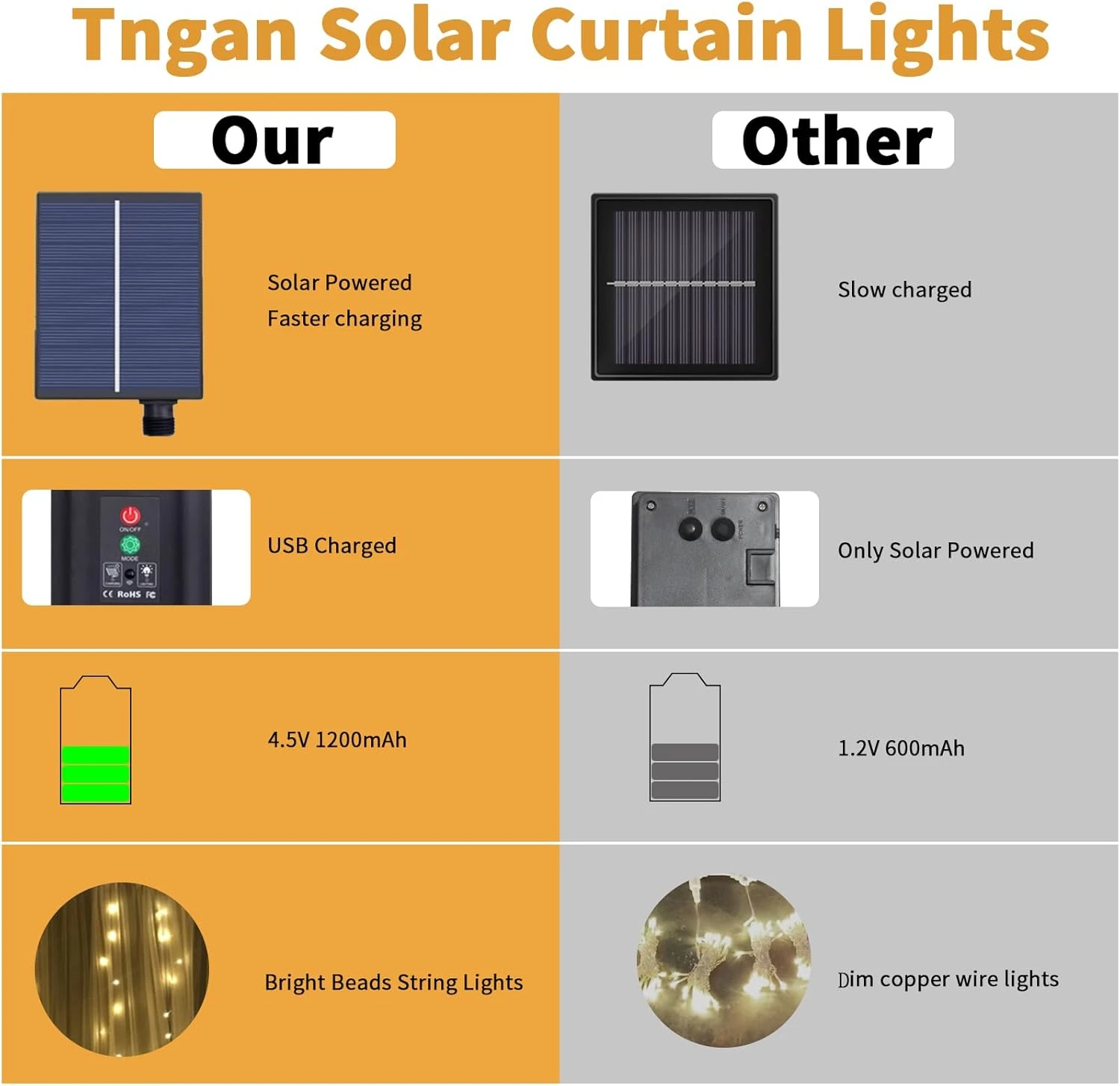 - 【Solar & USB Powered】Les rideaux solaires ont un panneau solaire extérieur et une prise de charge USB, et peuvent fonctionner pendant 8 à 12 heures sur une charge complète. Panneau solaire pouvant pivoter de 180 degrés pour une lumière directe maximale. Par temps humide ou nuageux, une interface de chargement USB peut augmenter le travail.