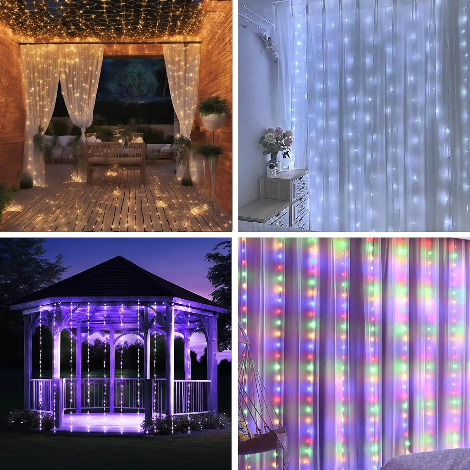 - 【Good Size】 9.8ft x 9.8ft (3m x 3m), 300 LED de surbrillance, 4.5V Safe/Low Voltage avec quatre styles de couleurs, y compris blanc chaud, blanc froid, Multi-Couleur et violet. Les lumières peuvent éclairer une grande surface, créant des atmosphères attrayantes et agréables dans votre vie.