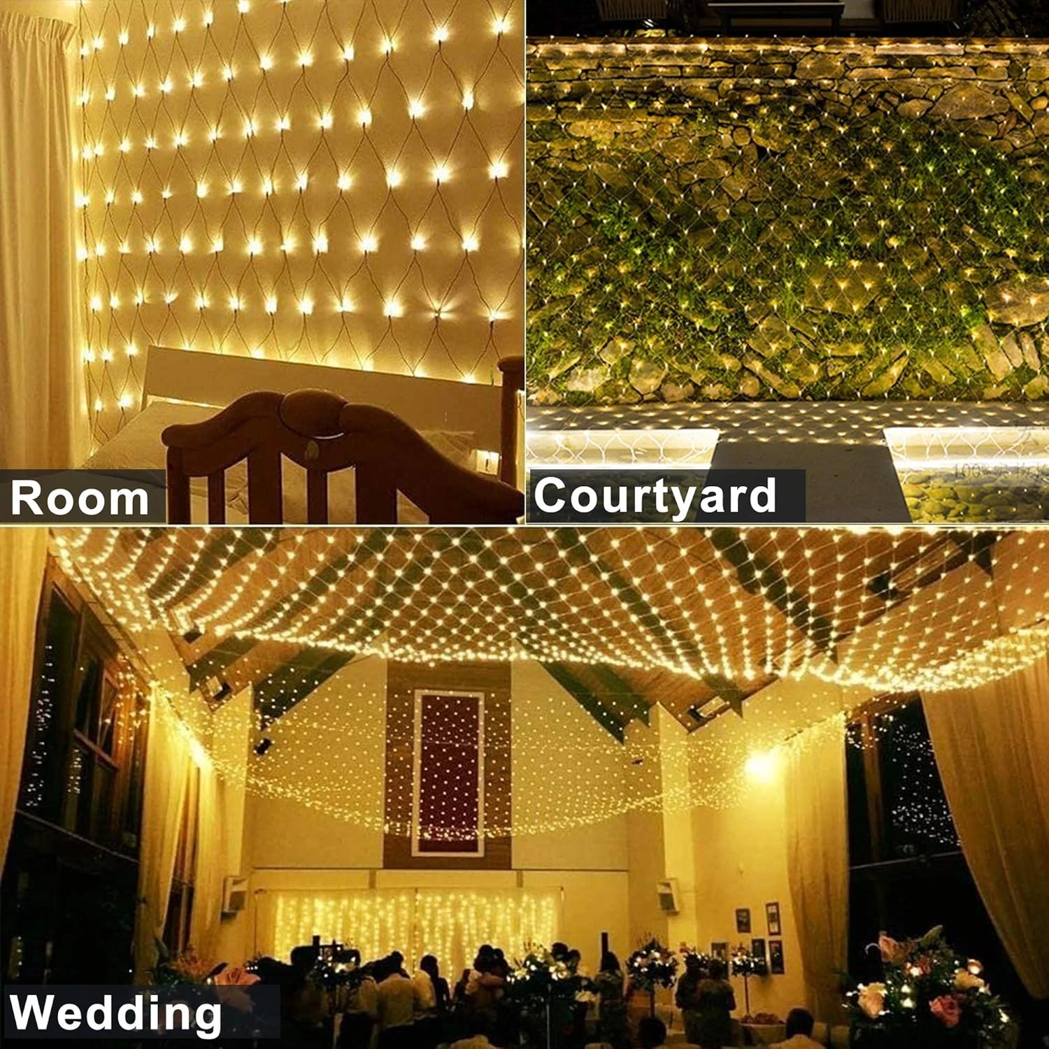 - Romantic Fairy Lights Net – Nos lumières en filet sont une grande décoration pour l’arbre de Noël, cour avant, jardins, toit, plafond, terrasse et buissons irréguliers, et juste accrocher ce filet de lumières et créer une atmosphère romantique pour les propositions, surprises, mariage, anniversaire, fêtes d’anniversaire, peut également utiliser pour la maison, rideaux de chambre décorations de fond.