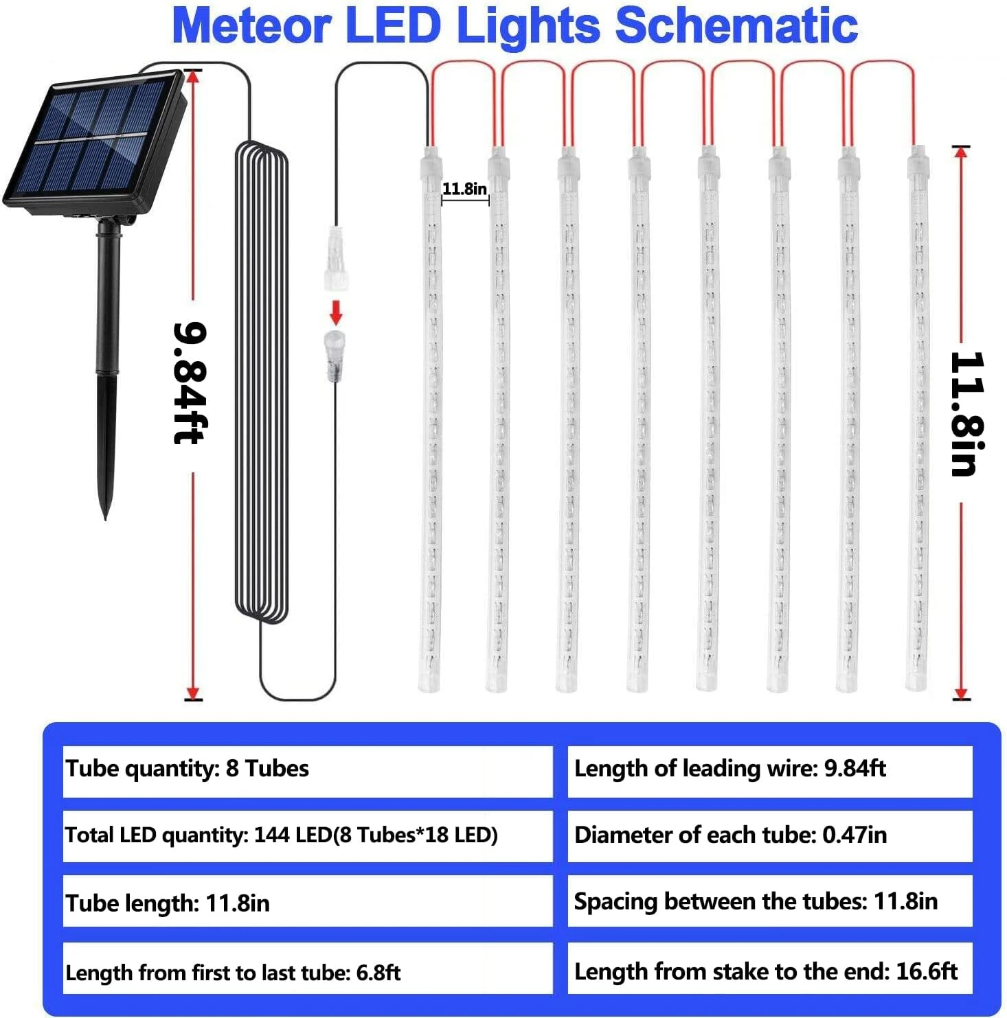 - Qu’est-ce que vous obtenez: 8 tubes*18 LED lumière de pluie de pluie de météores solaires, 1* piquet, 1*stand. La longueur de tube est 11.8in, longueur entre les tubes est 11.8in. Afin d’obtenir le look qui s’affiche dans l’image, vous devrez peut-être commander 5 à 8 lumières de météores en fonction du rayon de l’arbre. Si vous voulez acheter 2 ensembles de lumières de pluie de météores ou plus, cliquez sur le magasin YEGUO, nous avons une grande valeur 2 ensembles de lumières de météores.