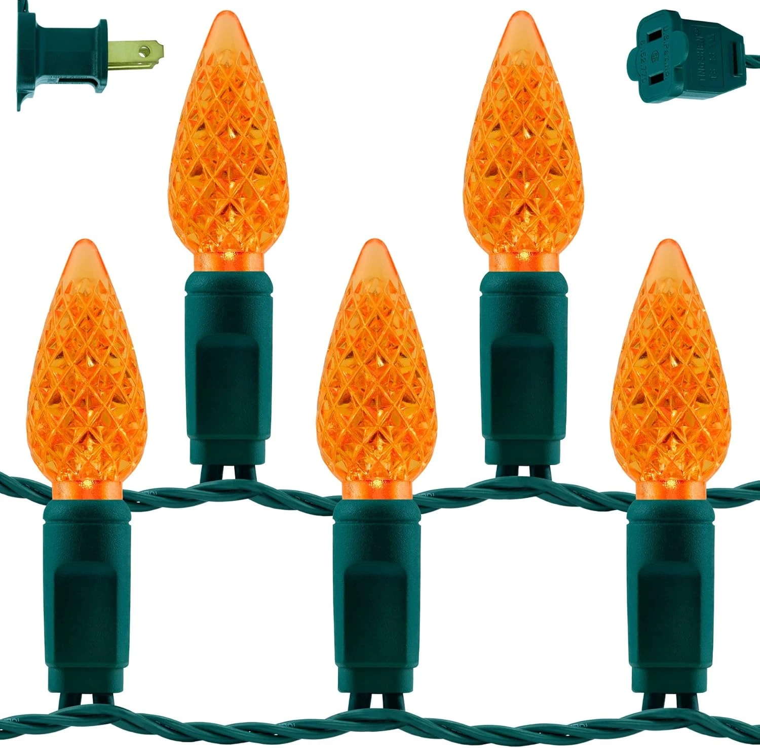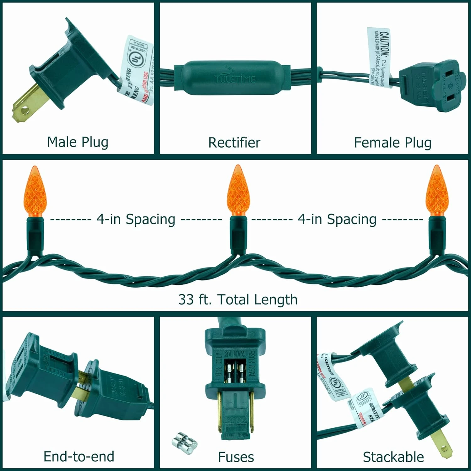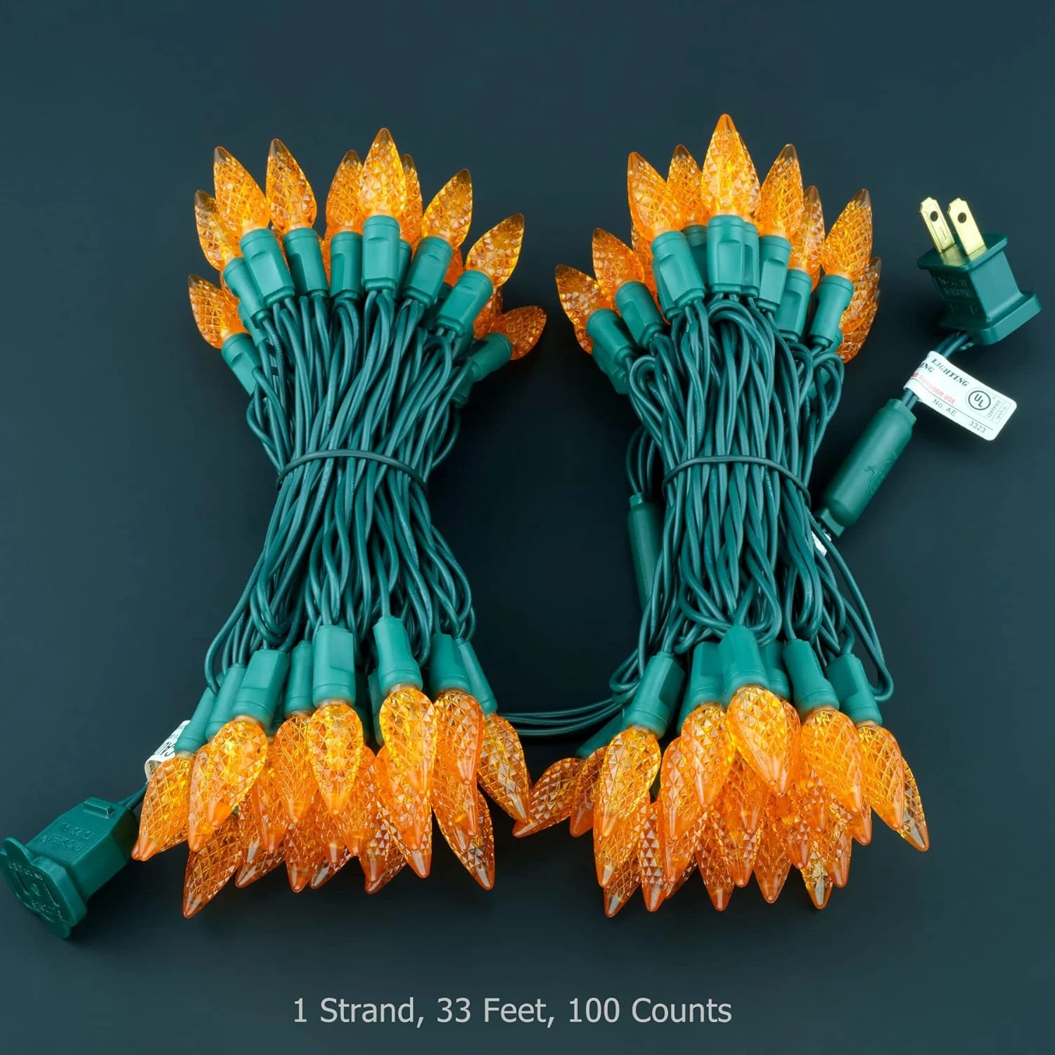 - SPÉCIFICATIONS ♥ 100 ampoules LED orange C6 fraise sur fil vert, longueur totale de la section éclairée est de 33 pieds, espacement de 4 pouces, plomb de 4 pouces, queue de 4 pouces. Les fiches femelles et les fiches mâles empilables peuvent être connectées pour permettre une utilisation prolongée des connexions de bout en bout. La puissance réelle de l’ensemble de la chaîne de lumières est de 7,2 watts et la puissance nominale maximale connectée est de 216 watts avec jusqu’à 30 brins fonctionnant simultanément.
